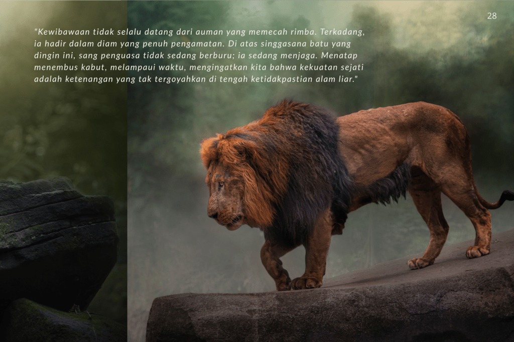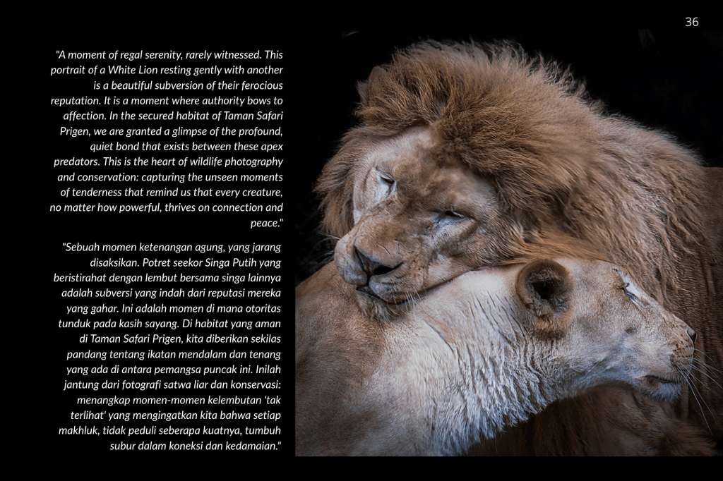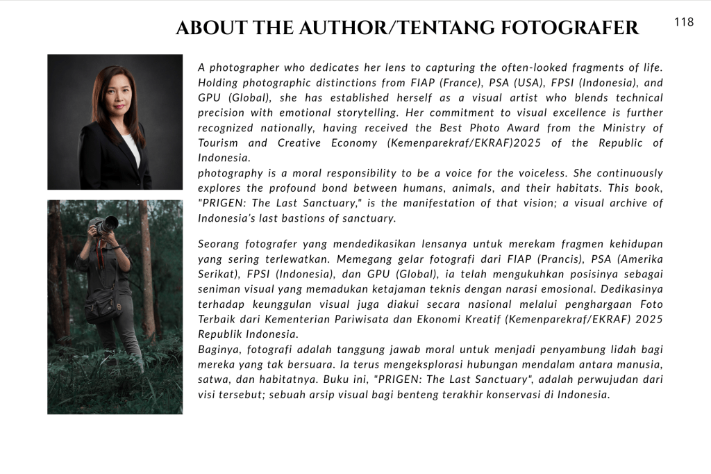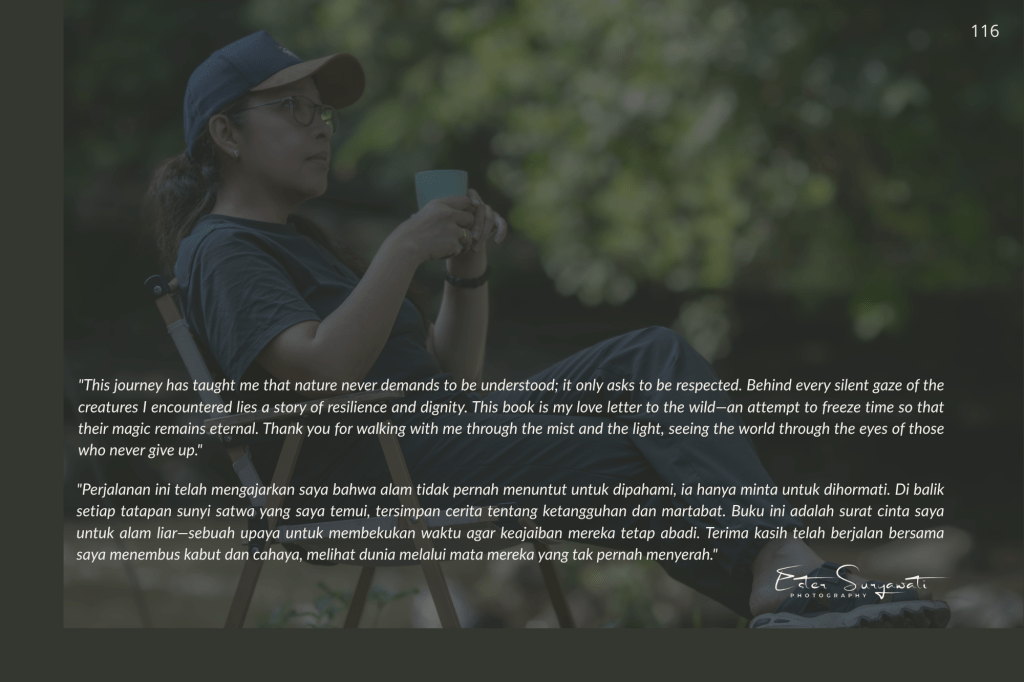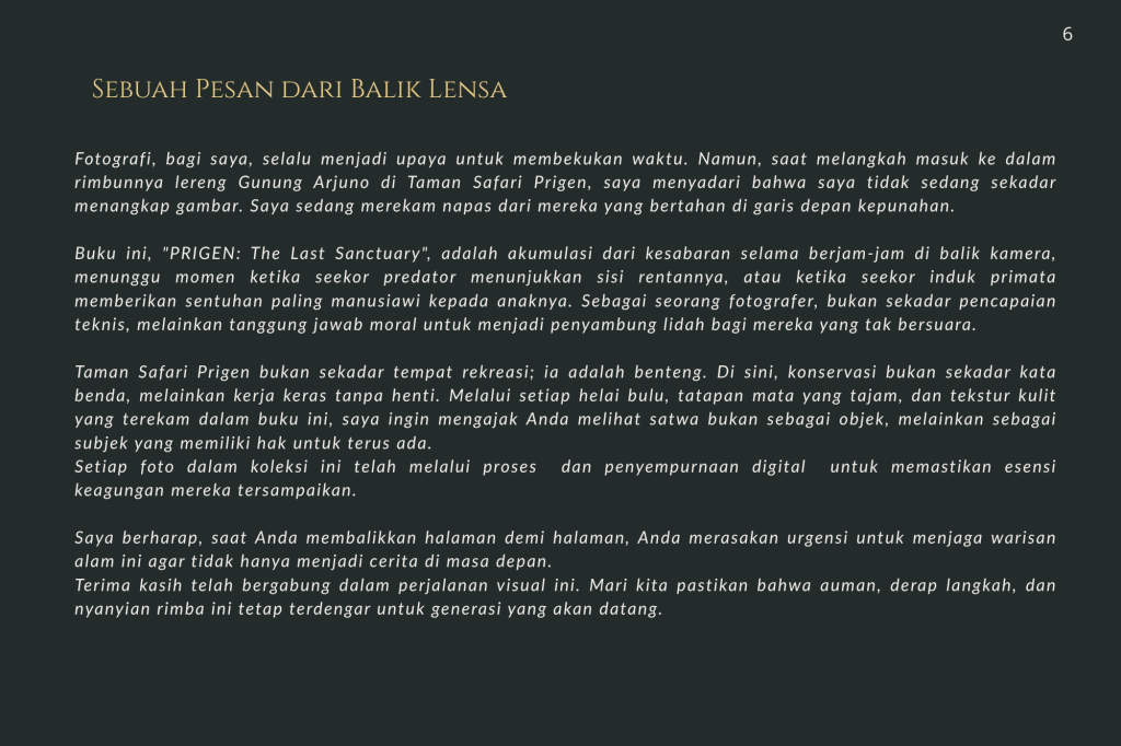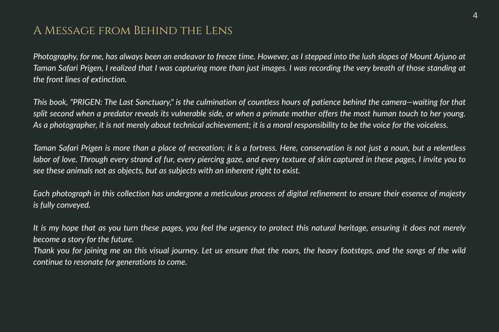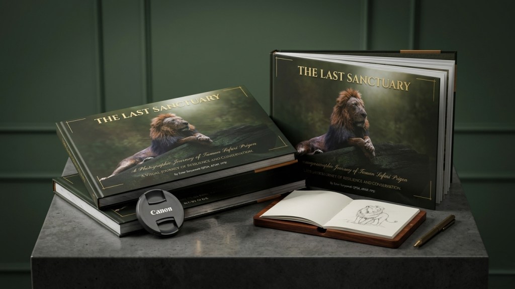 Buku ini, “PRIGEN: The Last Sanctuary”, adalah akumulasi dari kesabaran selama berjam-jam di balik kamera, menunggu momen ketika seekor predator menunjukkan sisi rentannya, atau ketika seekor induk primata memberikan sentuhan paling manusiawi kepada anaknya. Sebagai seorang fotografer, bukan sekadar pencapaian teknis, melainkan tanggung jawab moral untuk menjadi penyambung lidah bagi mereka yang tak bersuara.