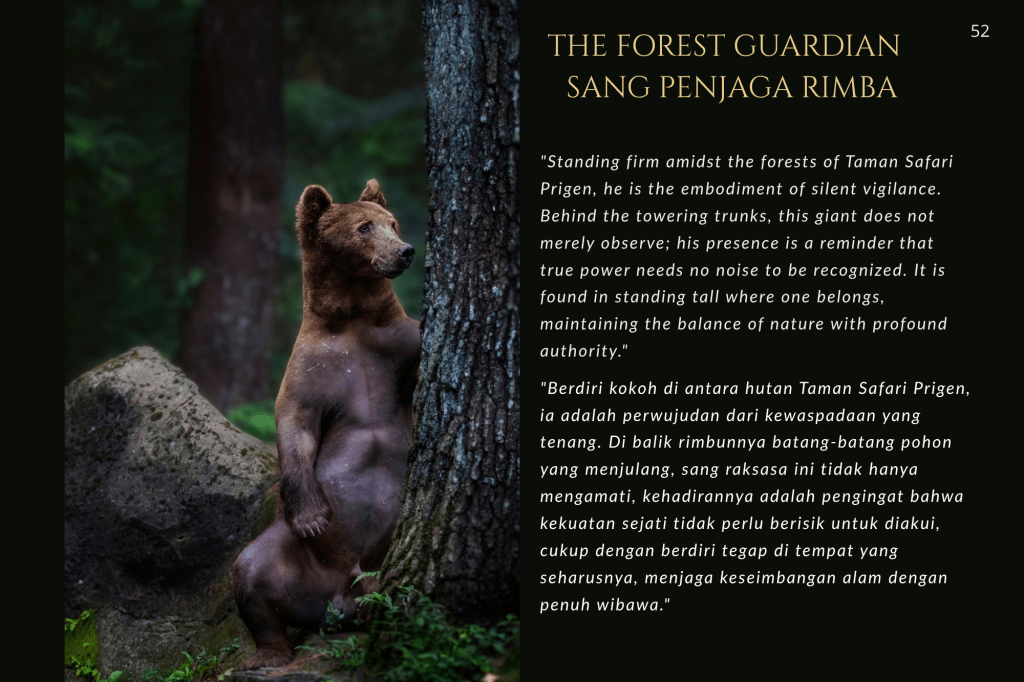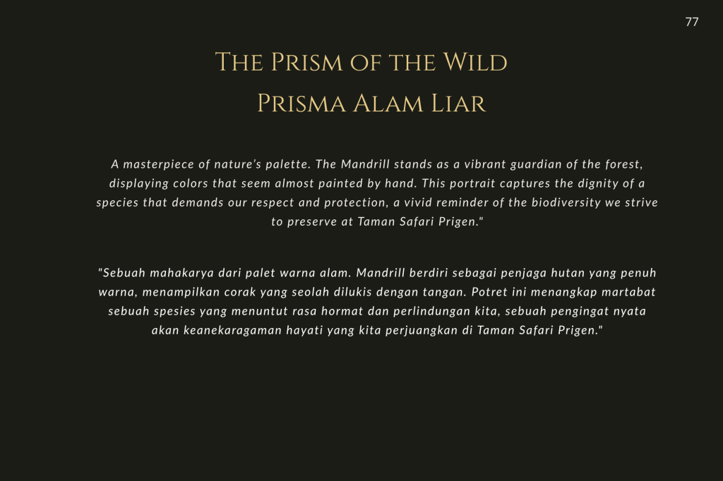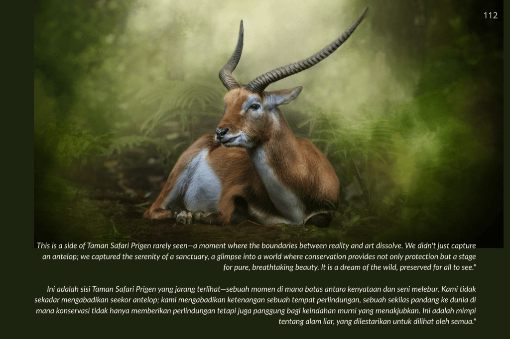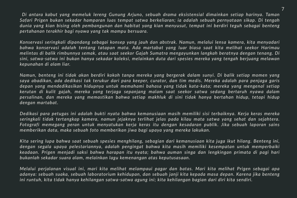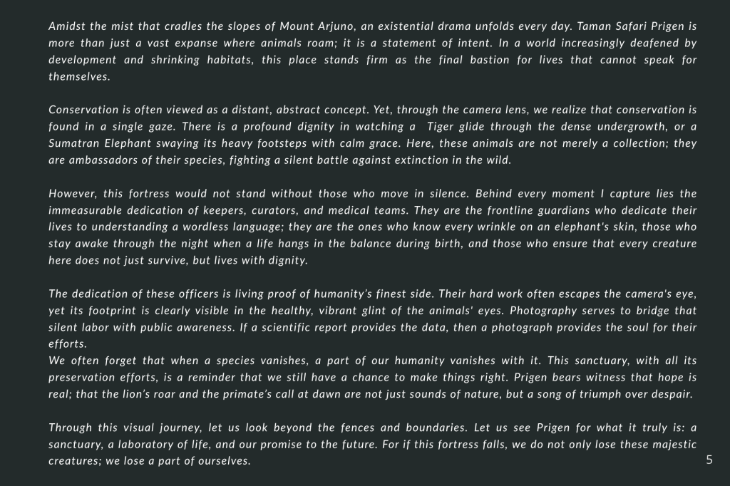 Taman Safari Prigen bukan sekadar tempat rekreasi; ia adalah benteng. Di sini, konservasi bukan sekadar kata benda, melainkan kerja keras tanpa henti. Melalui setiap helai bulu, tatapan mata yang tajam, dan tekstur kulit yang terekam dalam buku ini, saya ingin mengajak Anda melihat satwa bukan sebagai objek, melainkan sebagai subjek yang memiliki hak untuk terus ada.