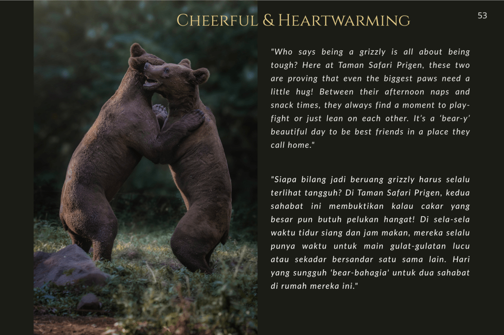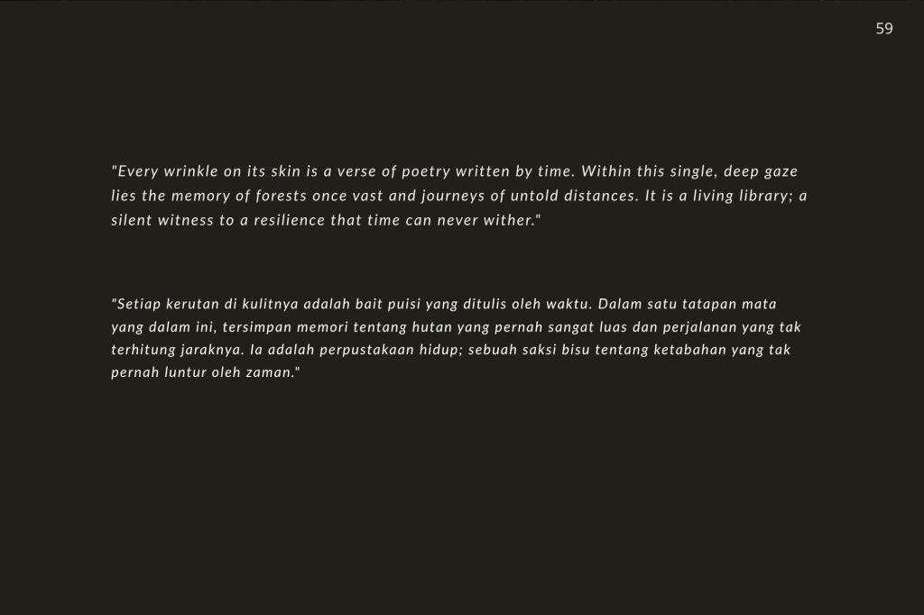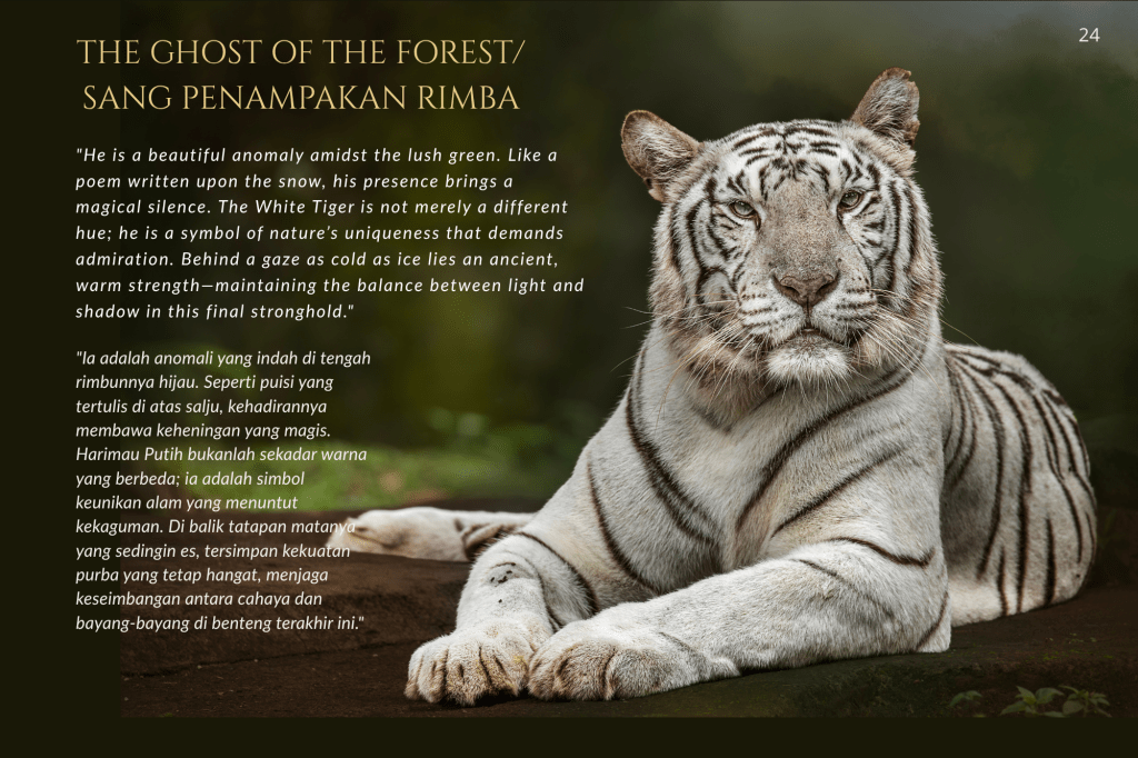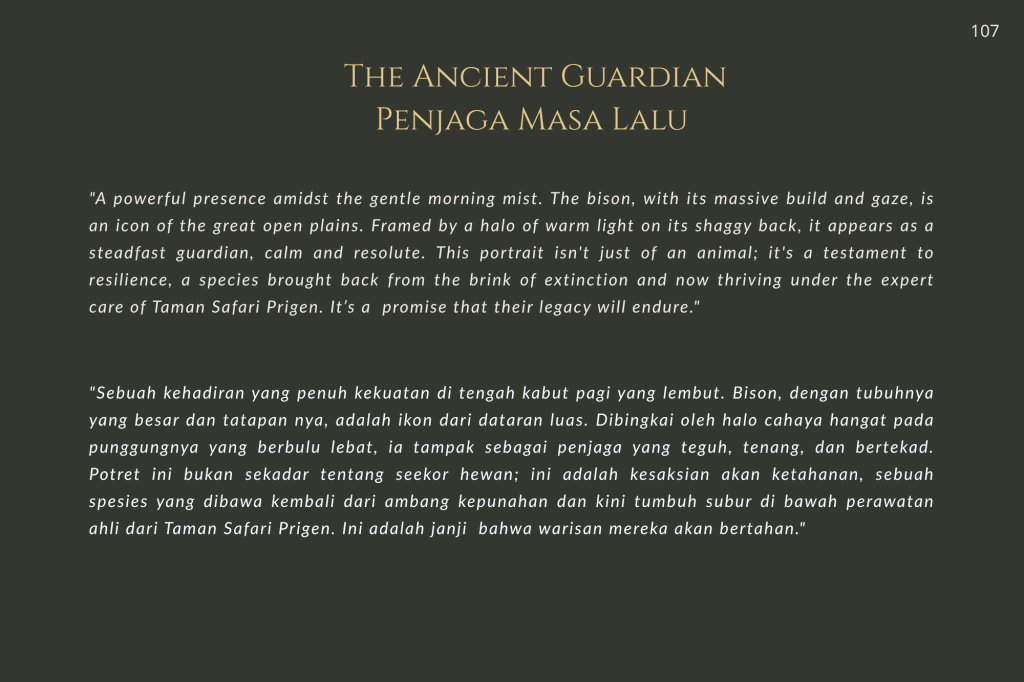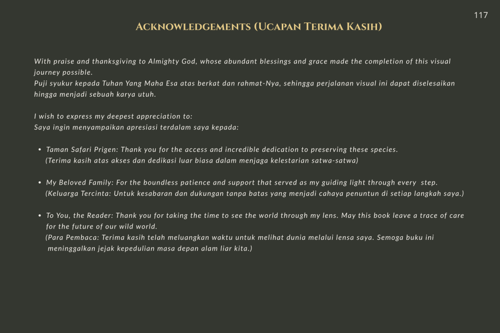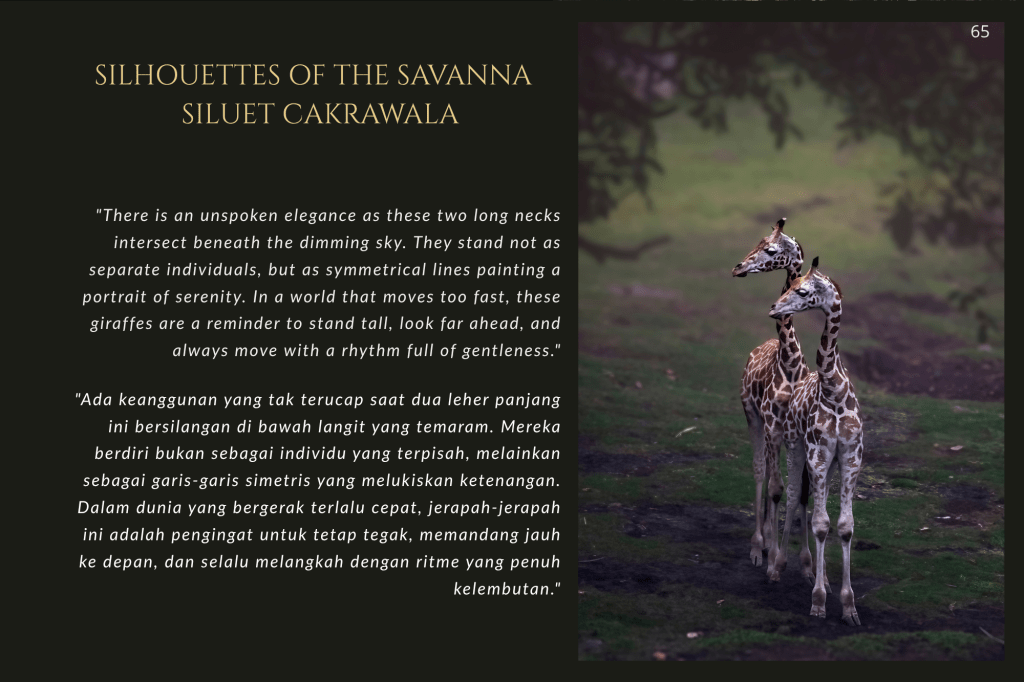Taman Safari Prigen bukan sekadar tempat rekreasi; ia adalah benteng. Di sini, konservasi bukan sekadar kata benda, melainkan kerja keras tanpa henti. Melalui setiap helai bulu, tatapan mata yang tajam, dan tekstur kulit yang terekam dalam buku ini, saya ingin mengajak Anda melihat satwa bukan sebagai objek, melainkan sebagai subjek yang memiliki hak untuk terus ada.