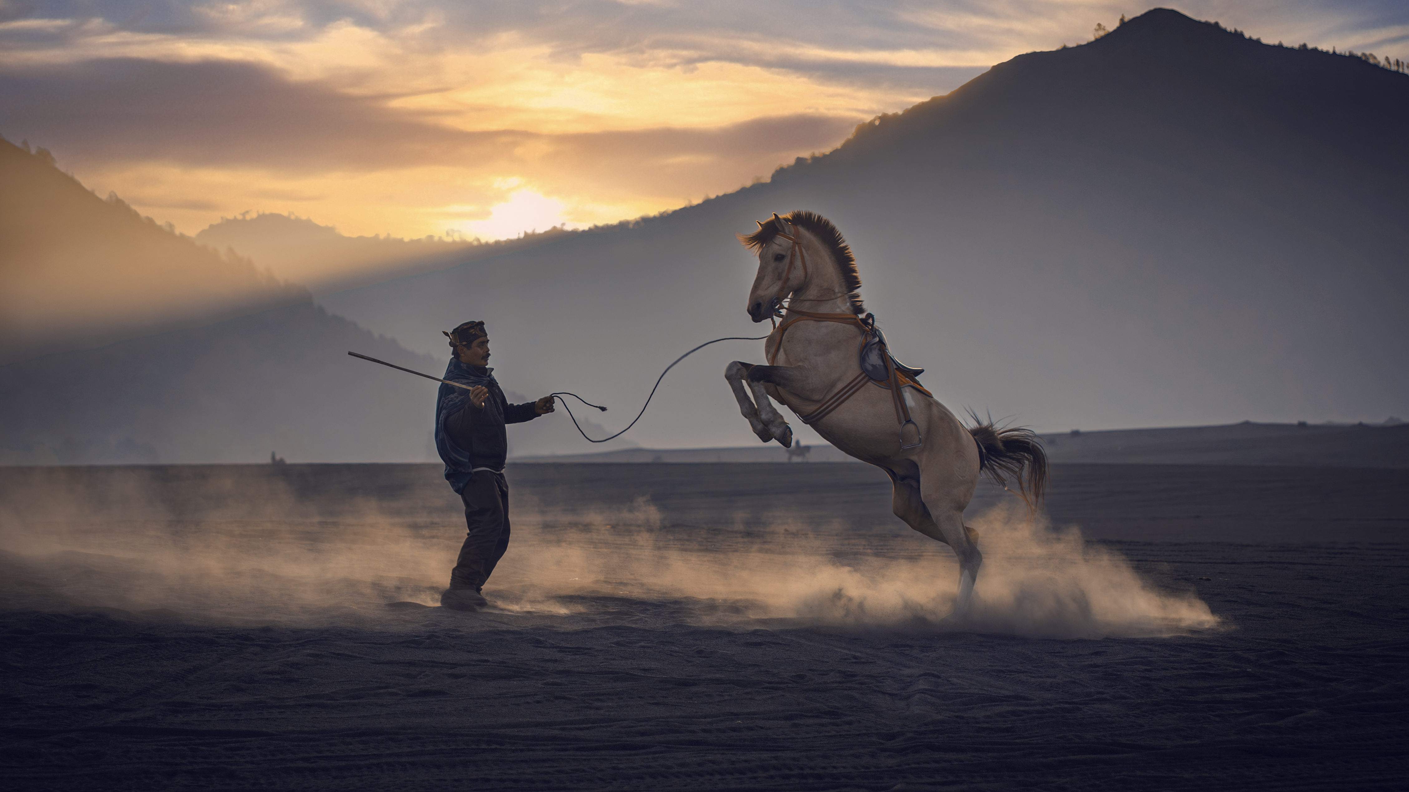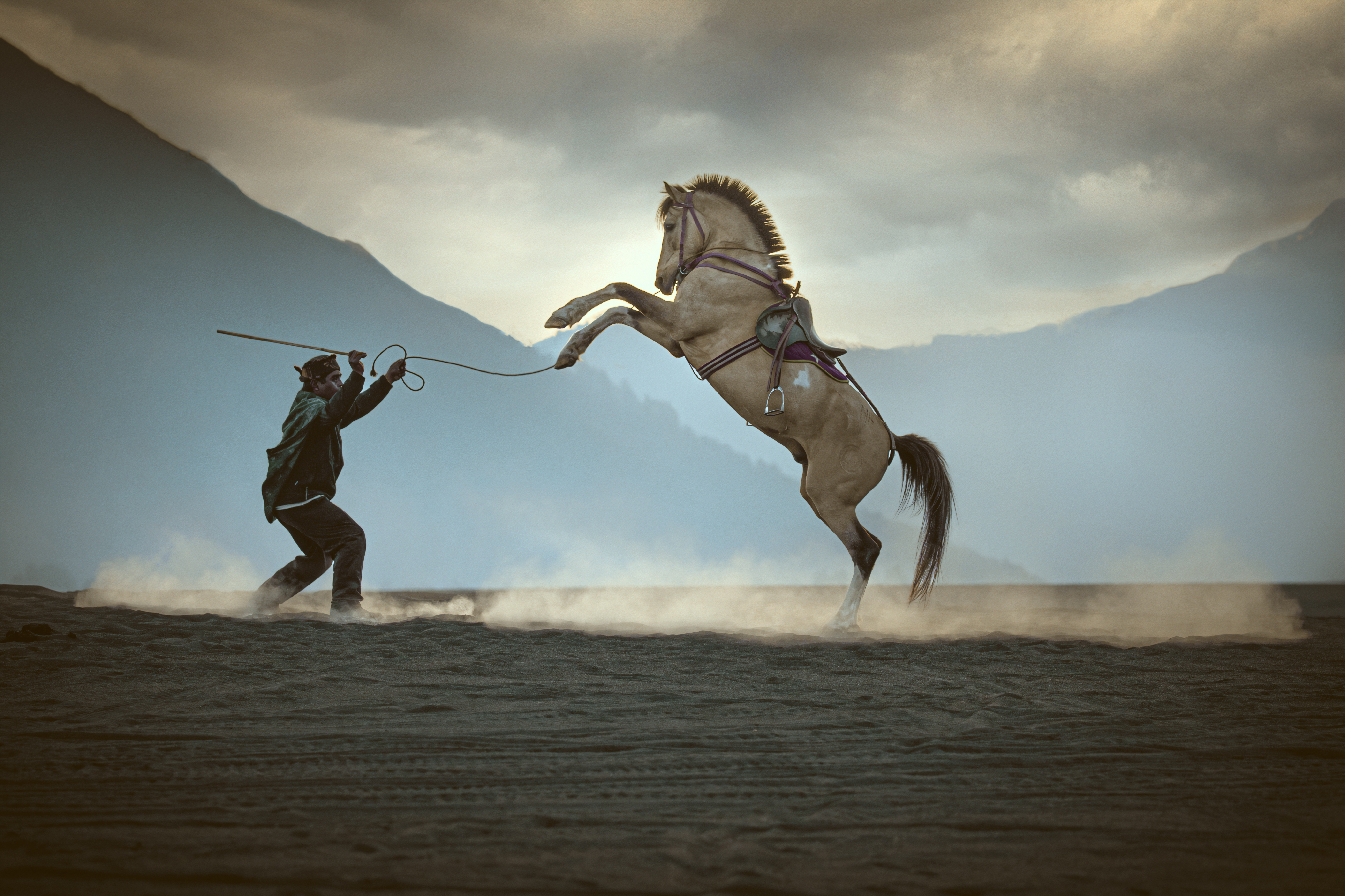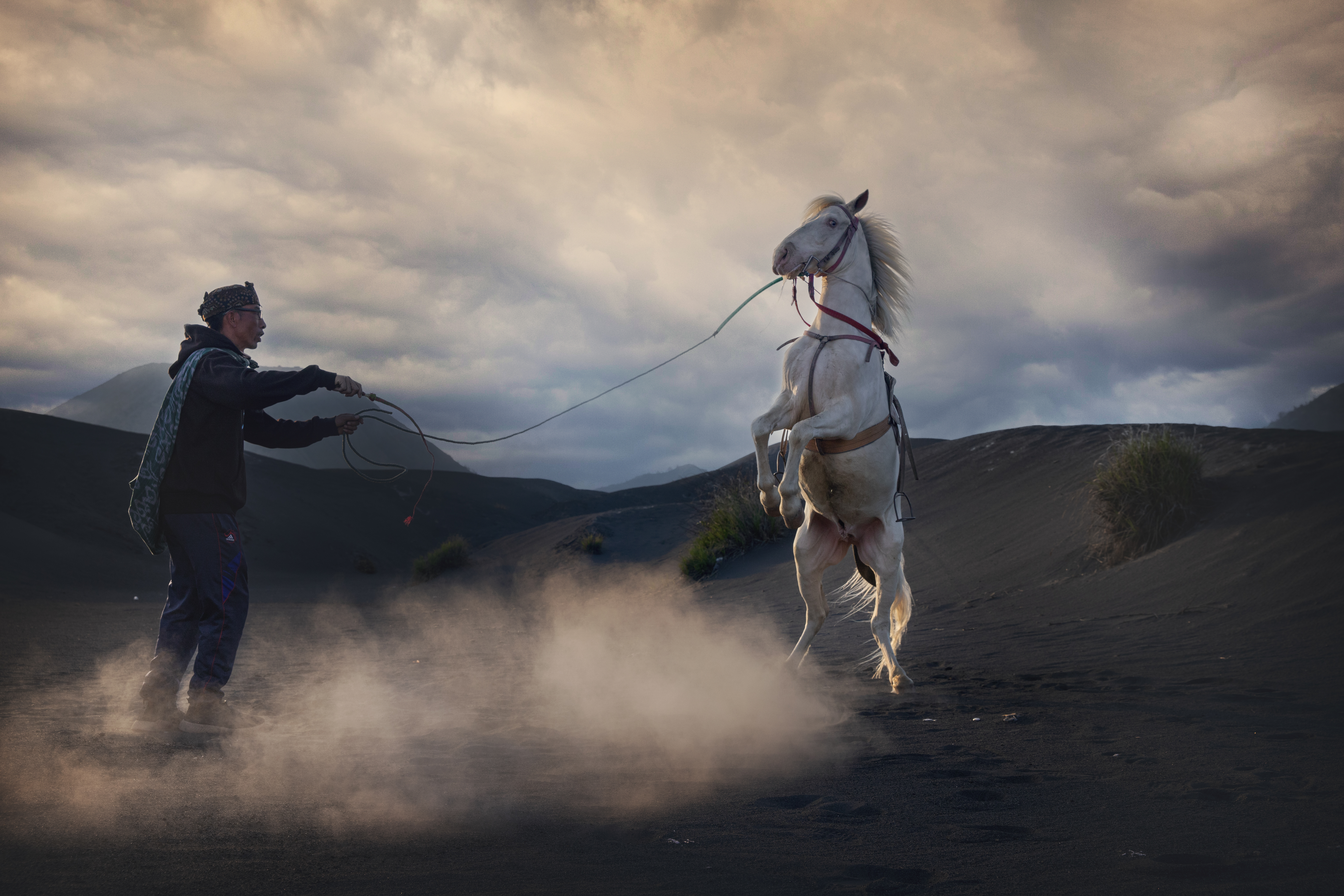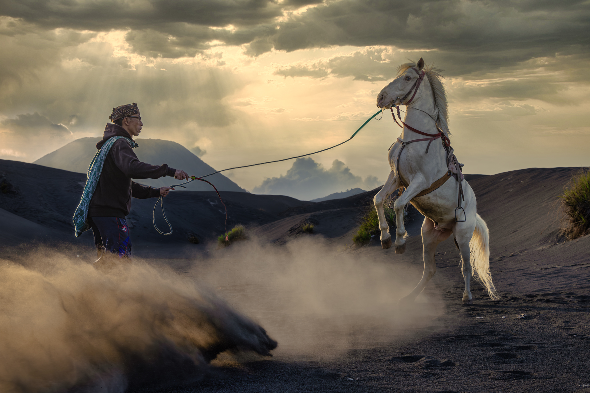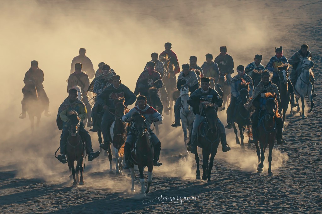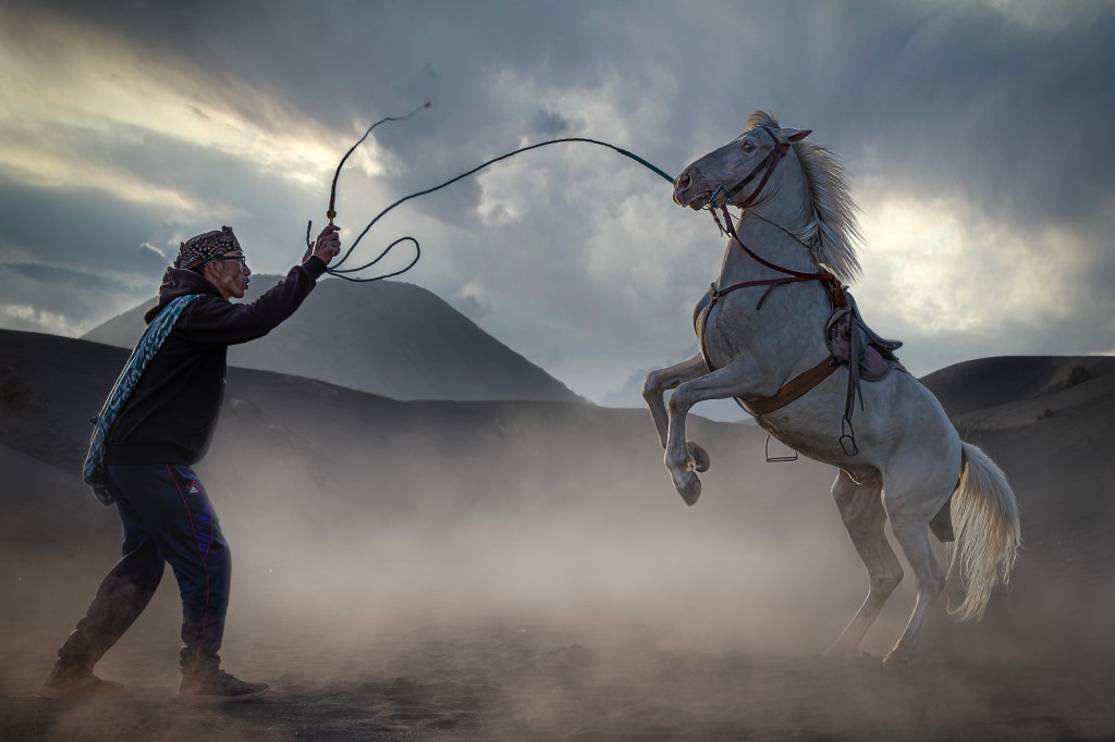 “Dengan tarikan lembut dan gelombang kepercayaan, manusia dan kuda bangkit sebagai satu kesatuan. Dalam sikap menantang ini, keahlian penunggang bertemu dengan jiwa kuda, menciptakan siluet adrenalin murni di tengah debu Bromo yang berputar-putar.”