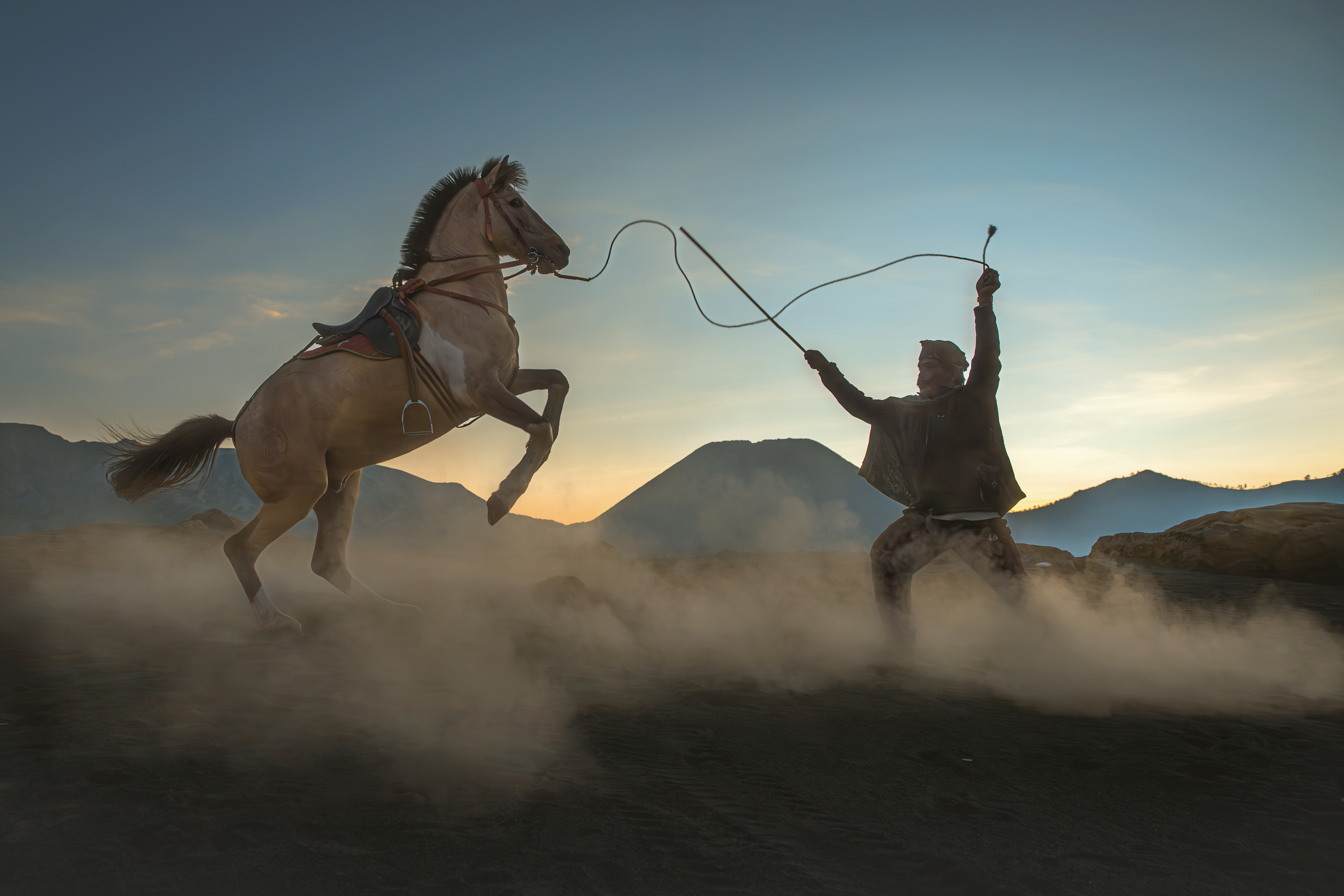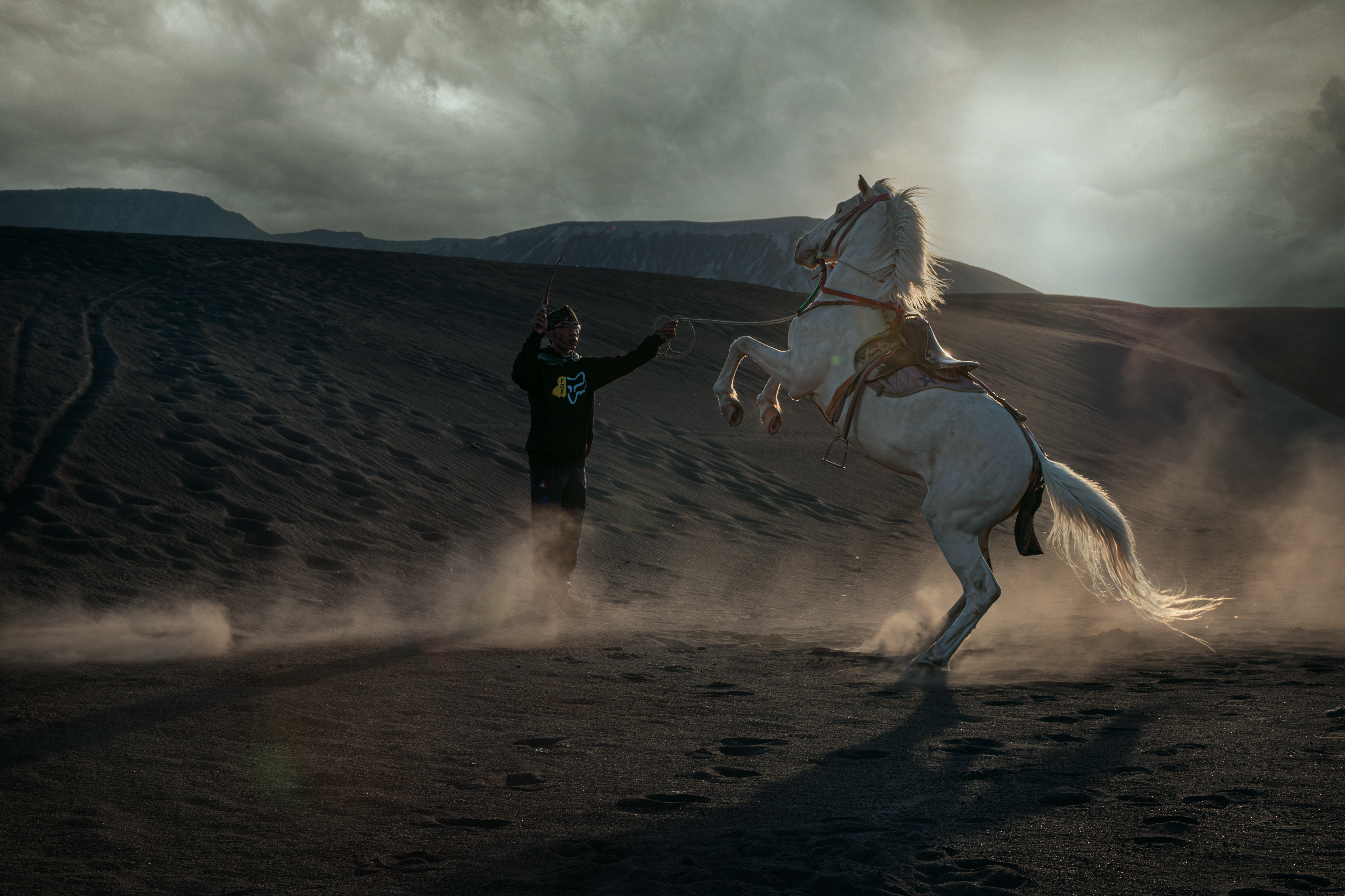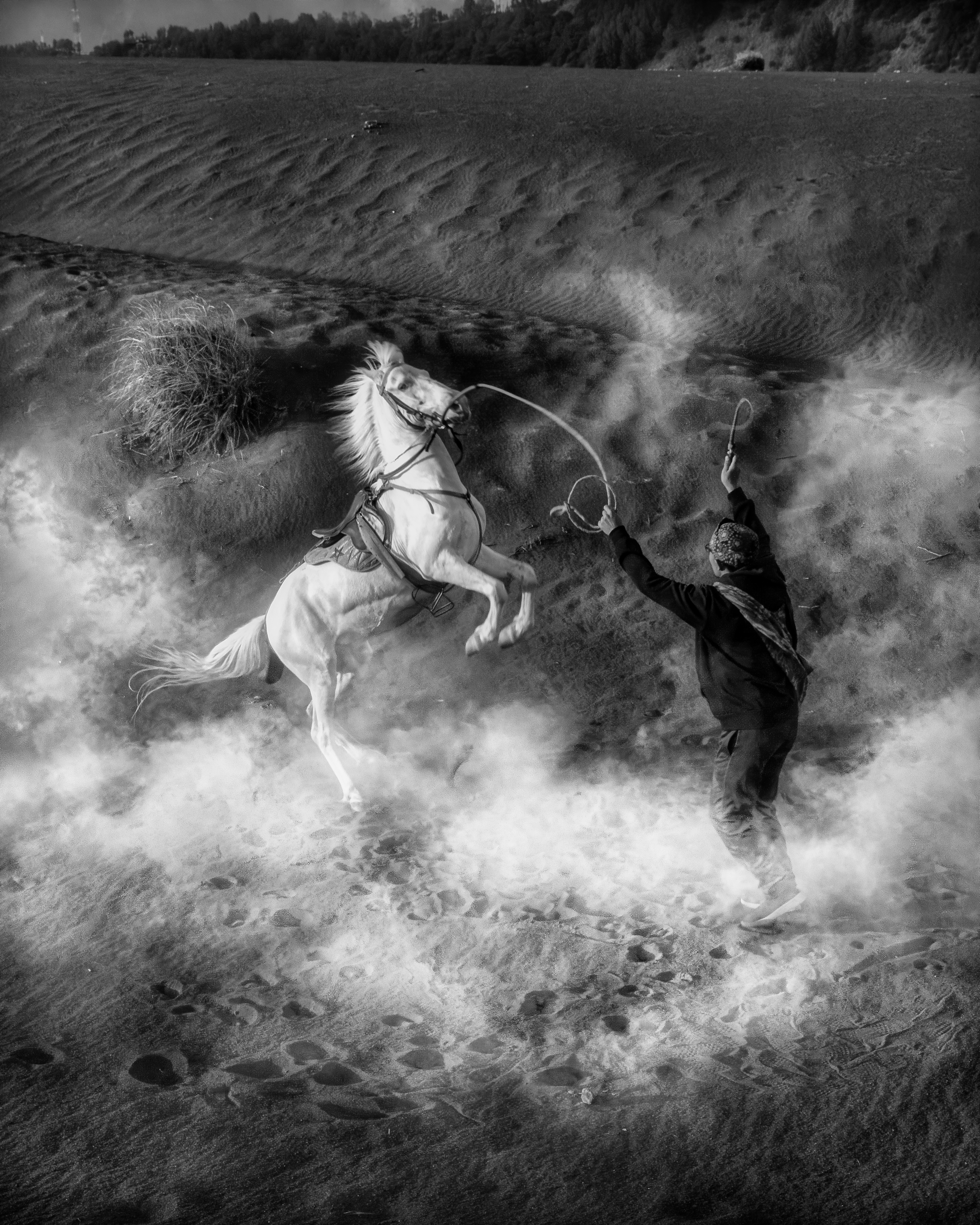 “With a gentle tug and a surge of trust, man and steed rise as one. In this defiant stance, the rider’s mastery meets the horse’s soul, creating a silhouette of pure adrenaline amidst the swirling dust of Bromo.”