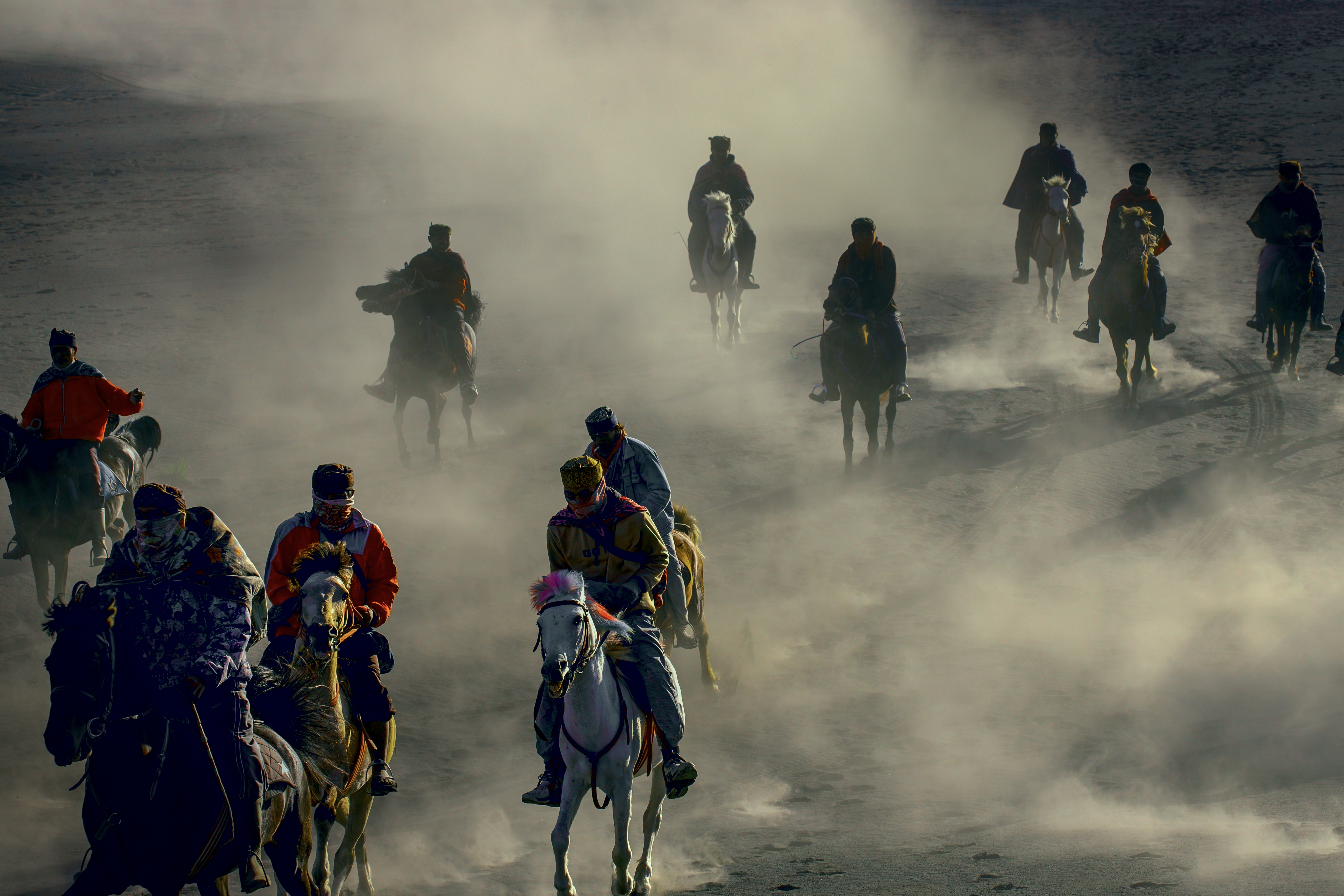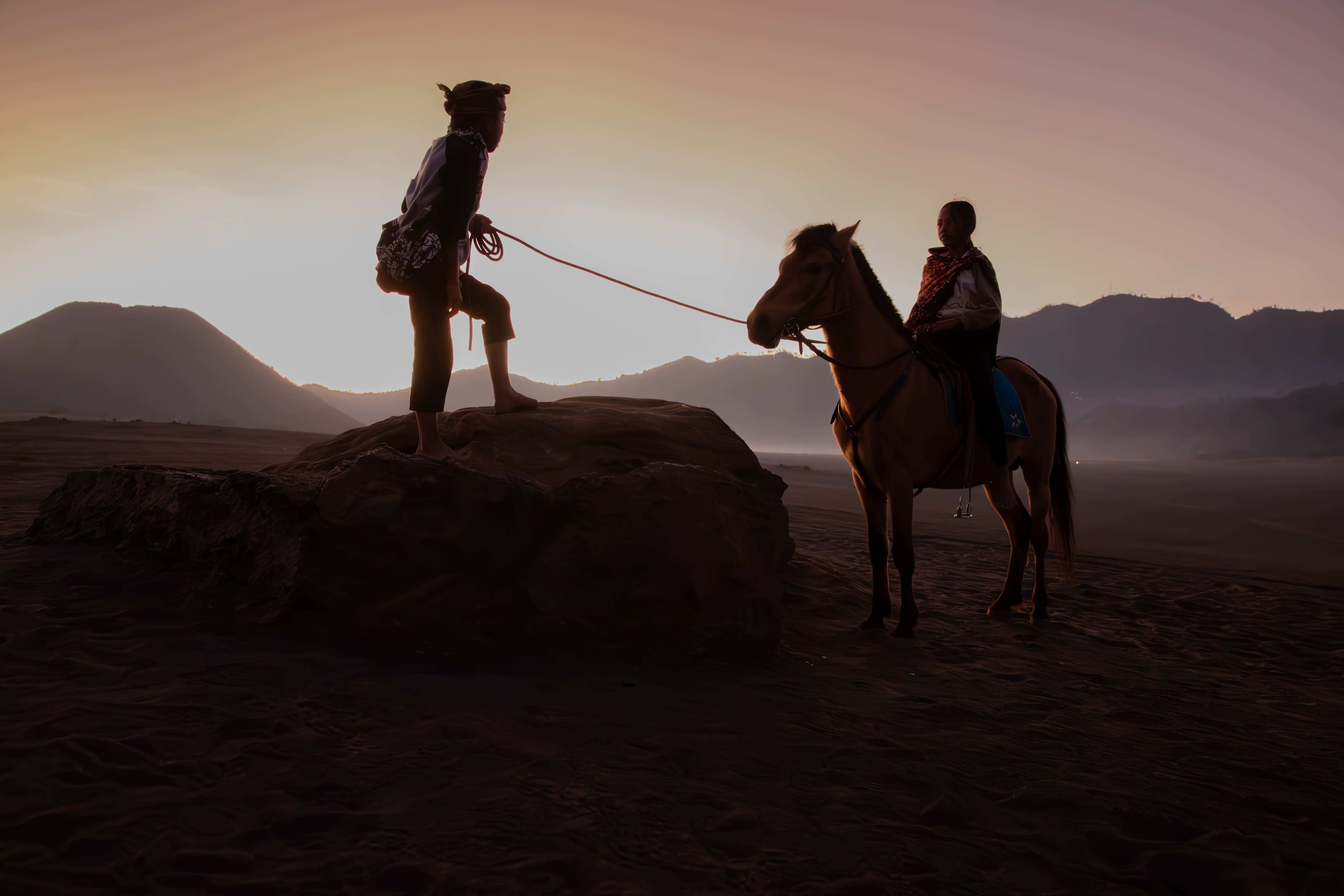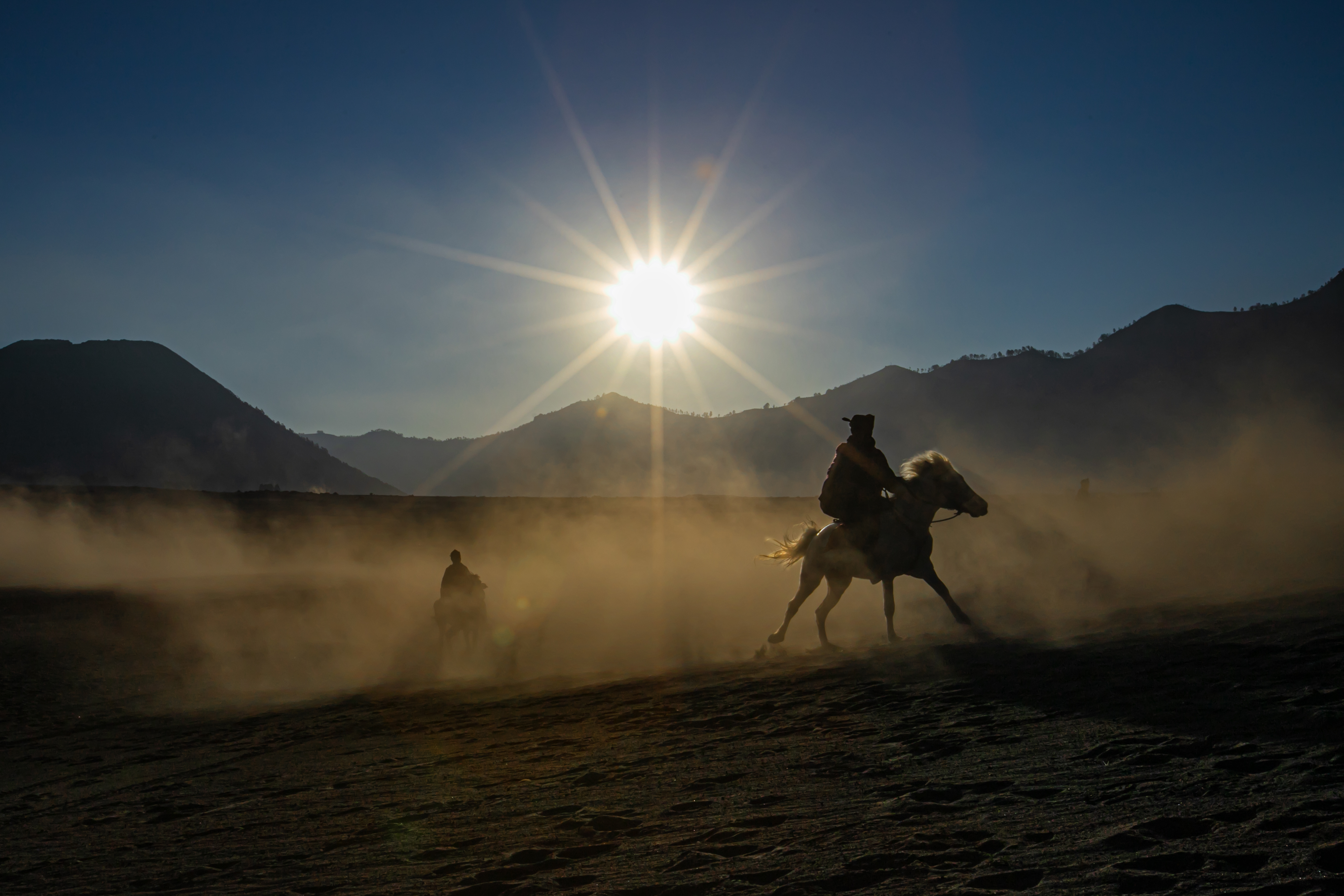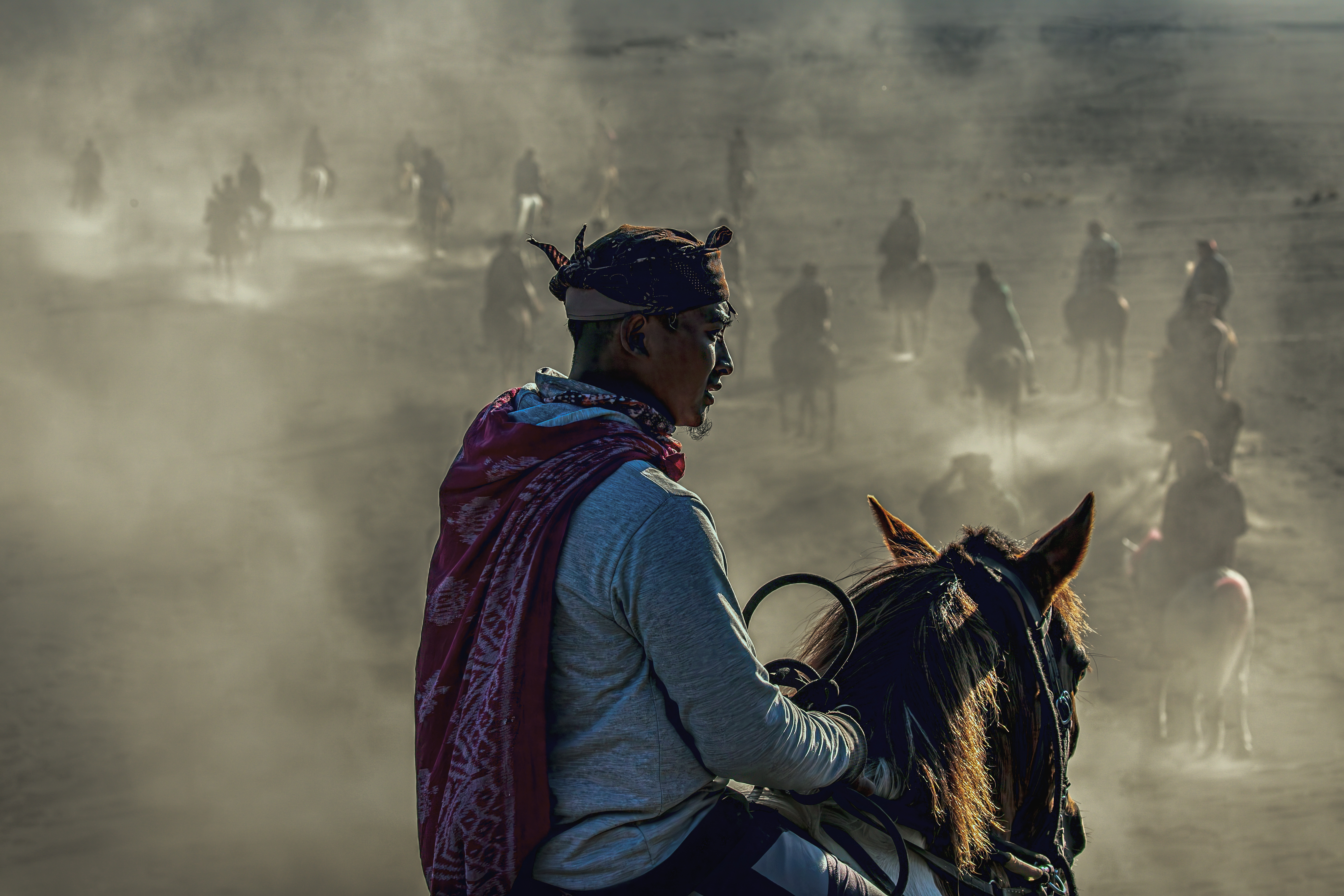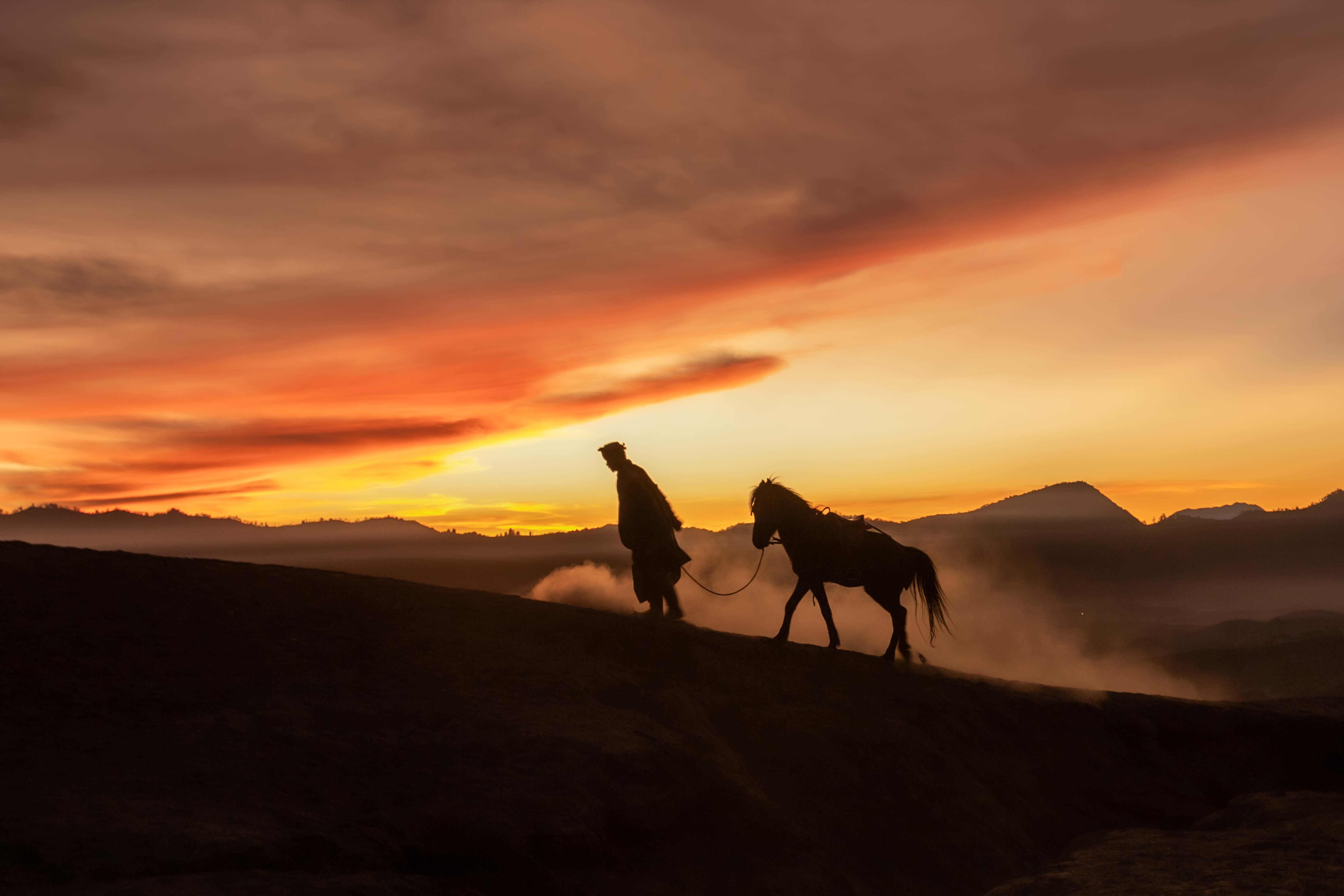 “As dawn breaks over the volcanic peaks, the Tenggerese awaken, their silhouettes merging with their trusted horses against the fiery sky. Together, they navigate the whispering sands, a timeless ballet of human resilience and natural grandeur.”