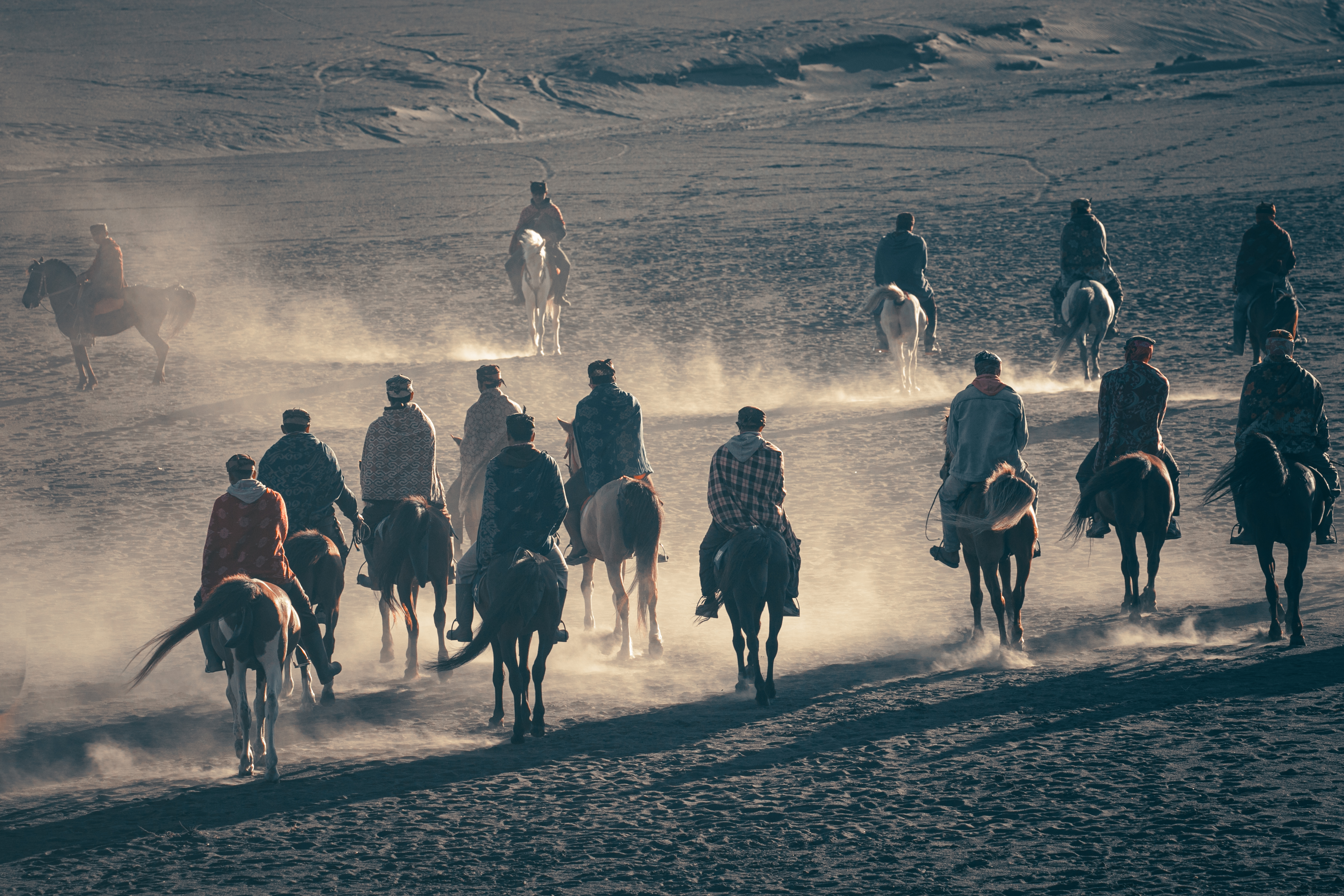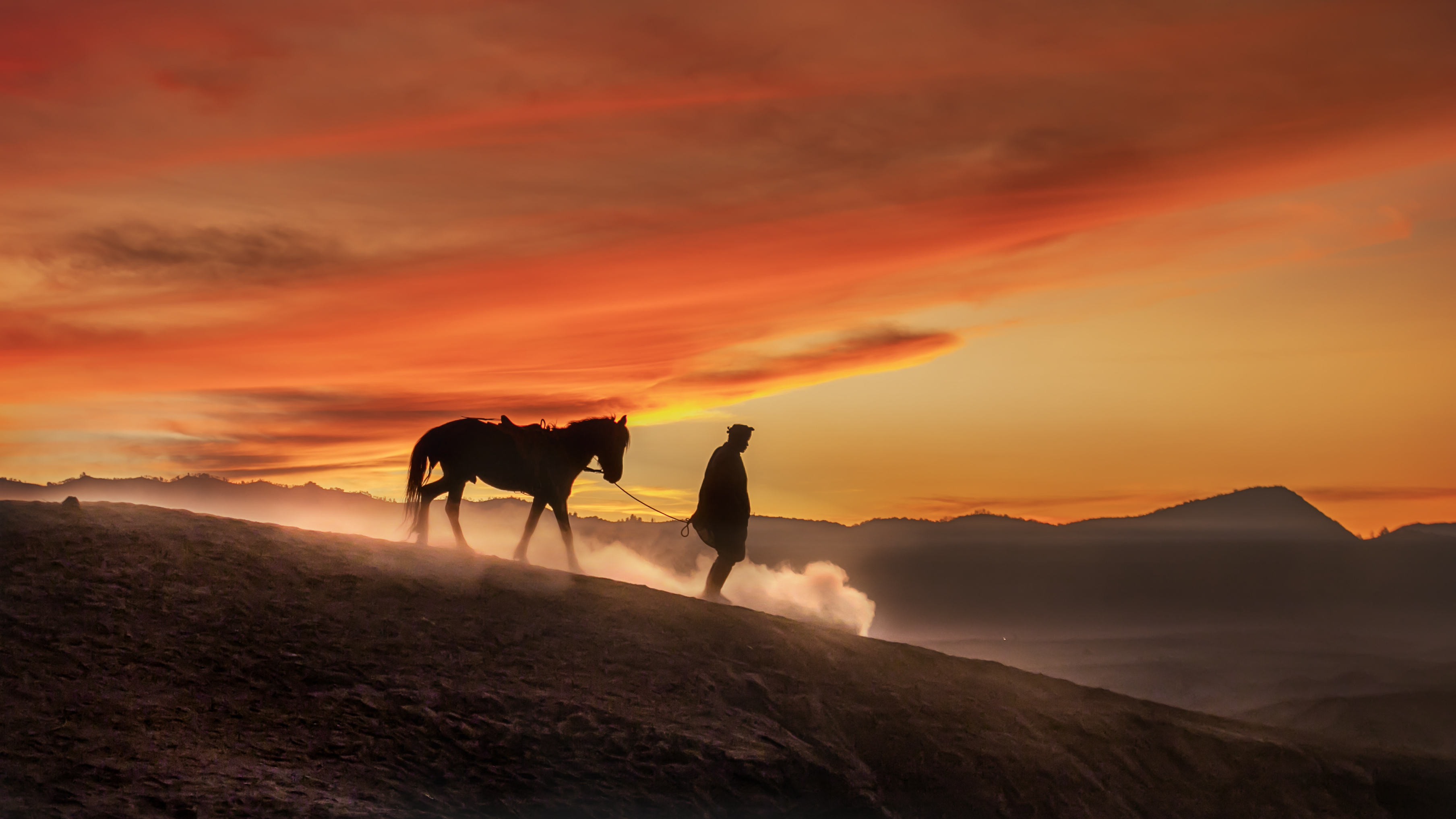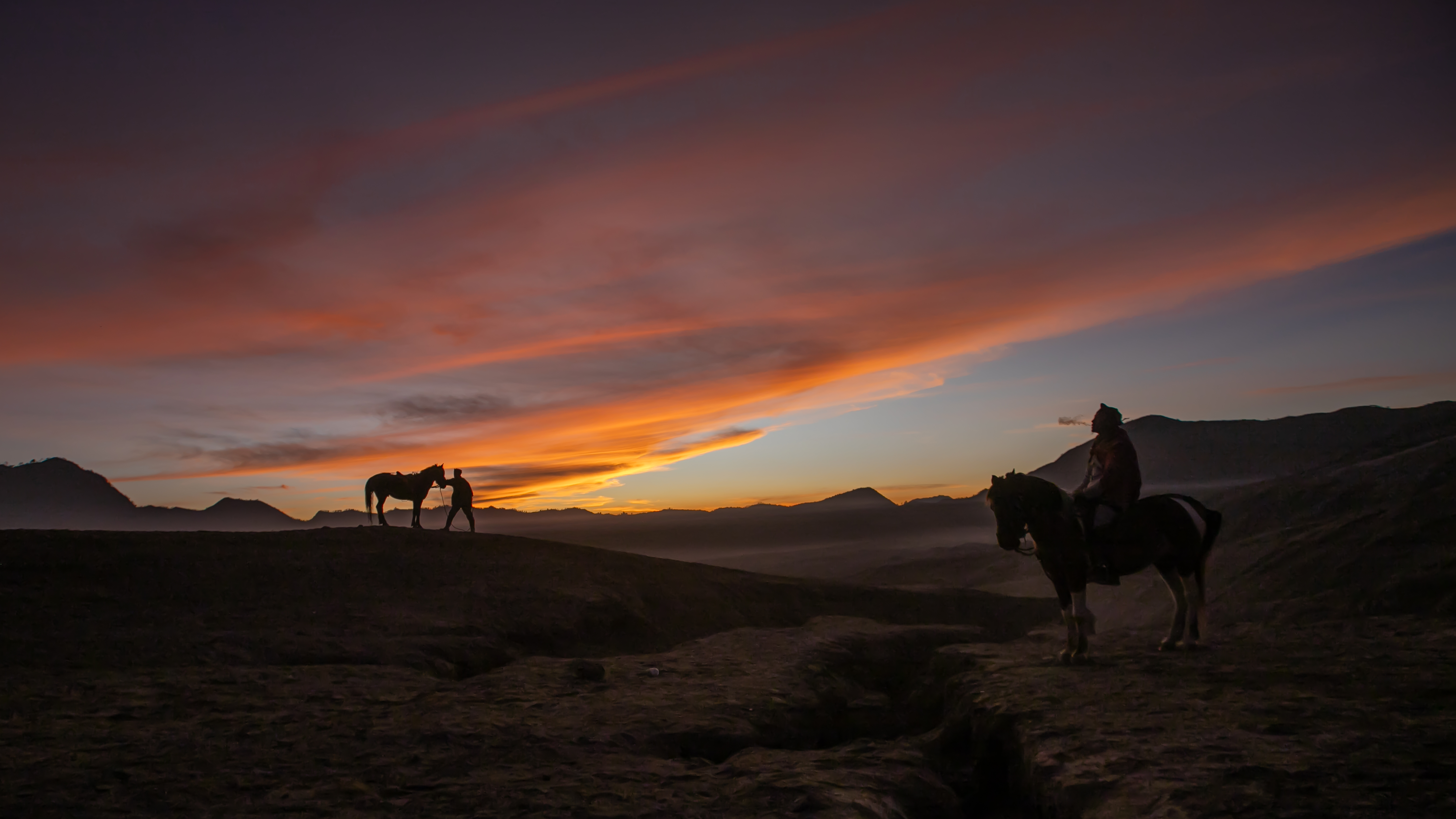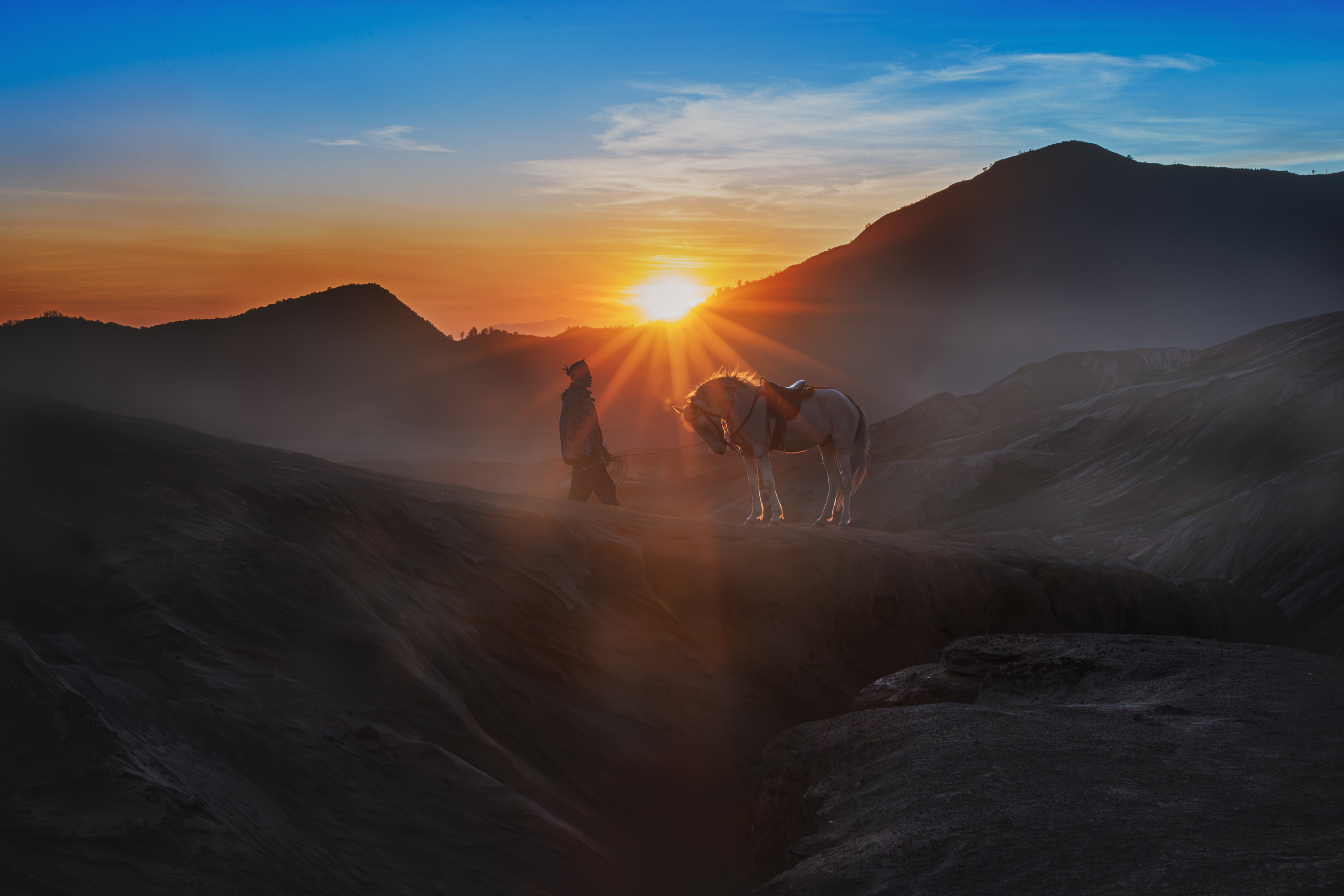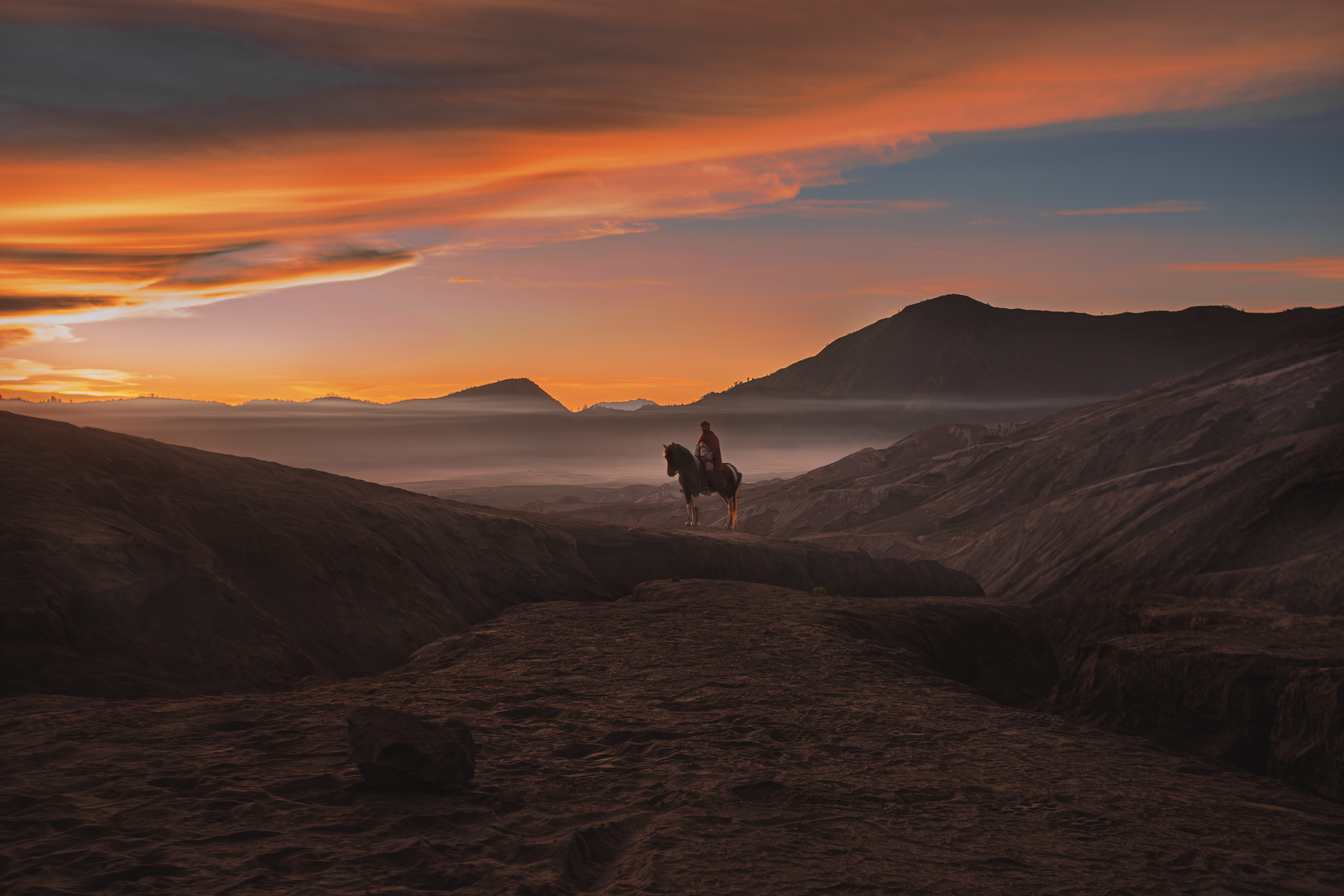 “As dawn breaks over the volcanic peaks, the Tenggerese awaken, their silhouettes merging with their trusted horses against the fiery sky. Together, they navigate the whispering sands, a timeless ballet of human resilience and natural grandeur.”