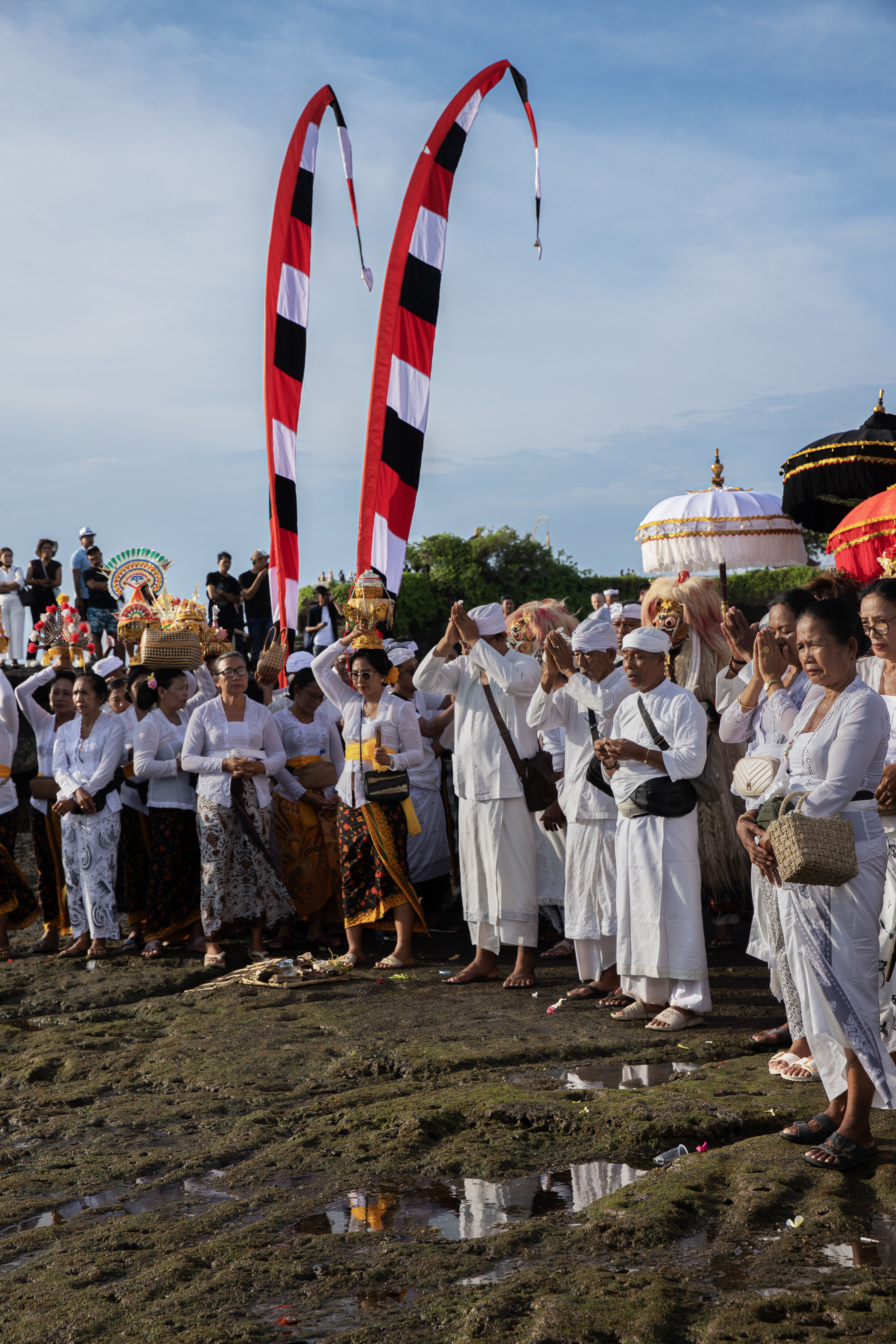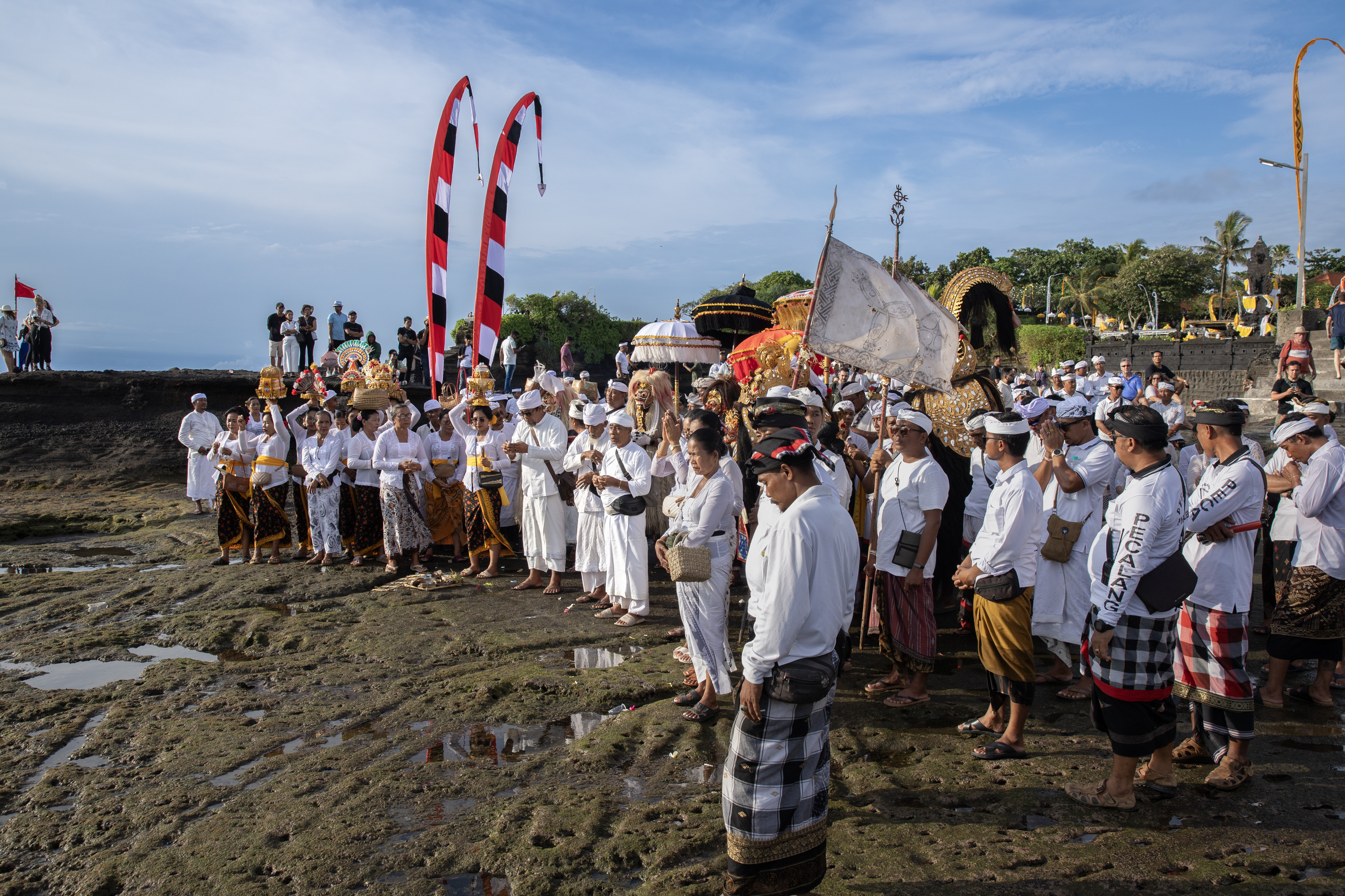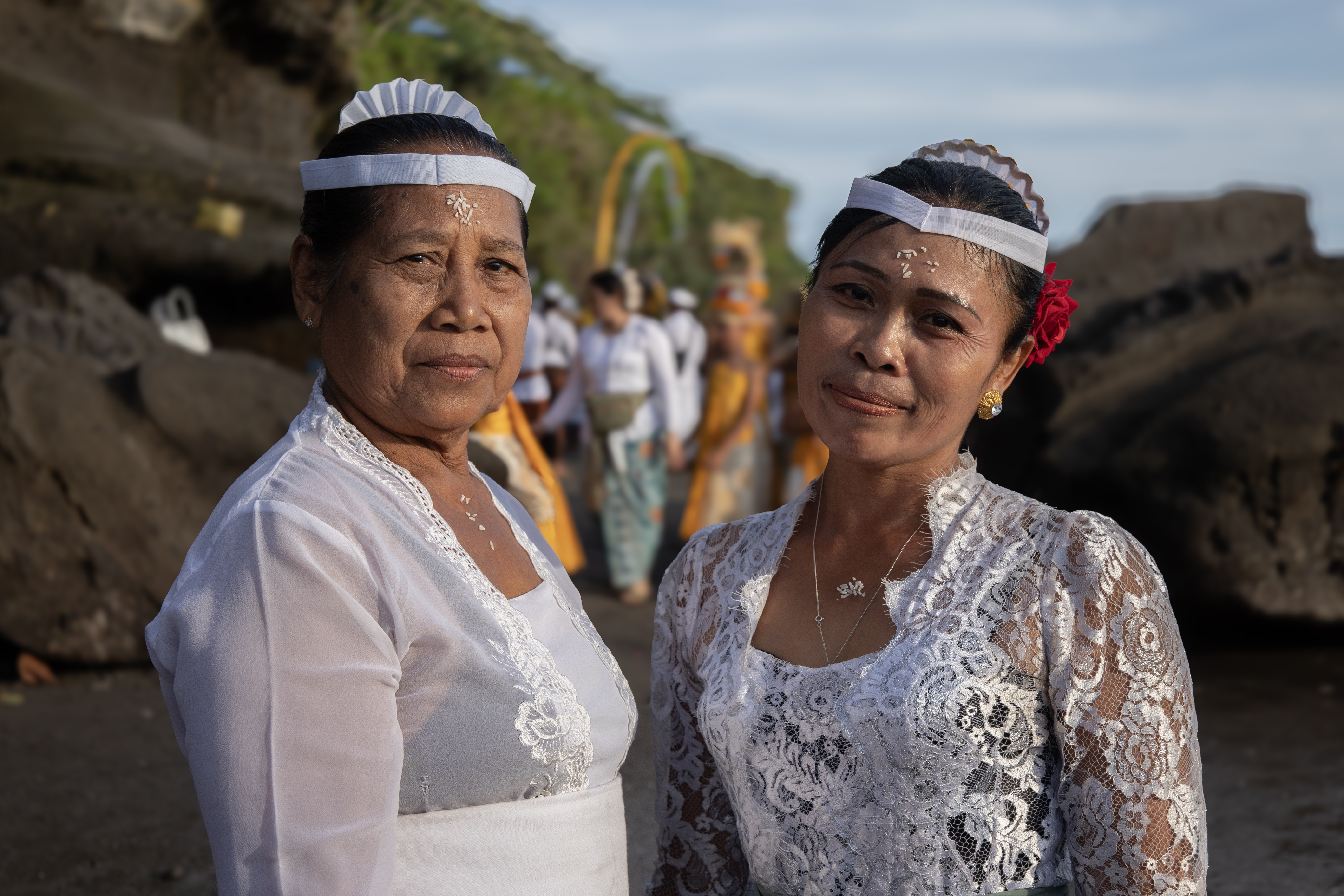 Pemandangan ratusan masyarakat Bali, berbusana putih, berjalan ke laut untuk menyucikan benda-benda sakral mereka saat matahari terbenam adalah pengalaman yang sangat menyentuh. Di tengah tontonan ini, saya mencari wajah-wajah para tetua, mata mereka memancarkan kebijaksanaan berusia berabad-abad dan keyakinan yang tak tergoyahkan. Potret mereka menjadi penghormatan bagi para penjaga tradisi.