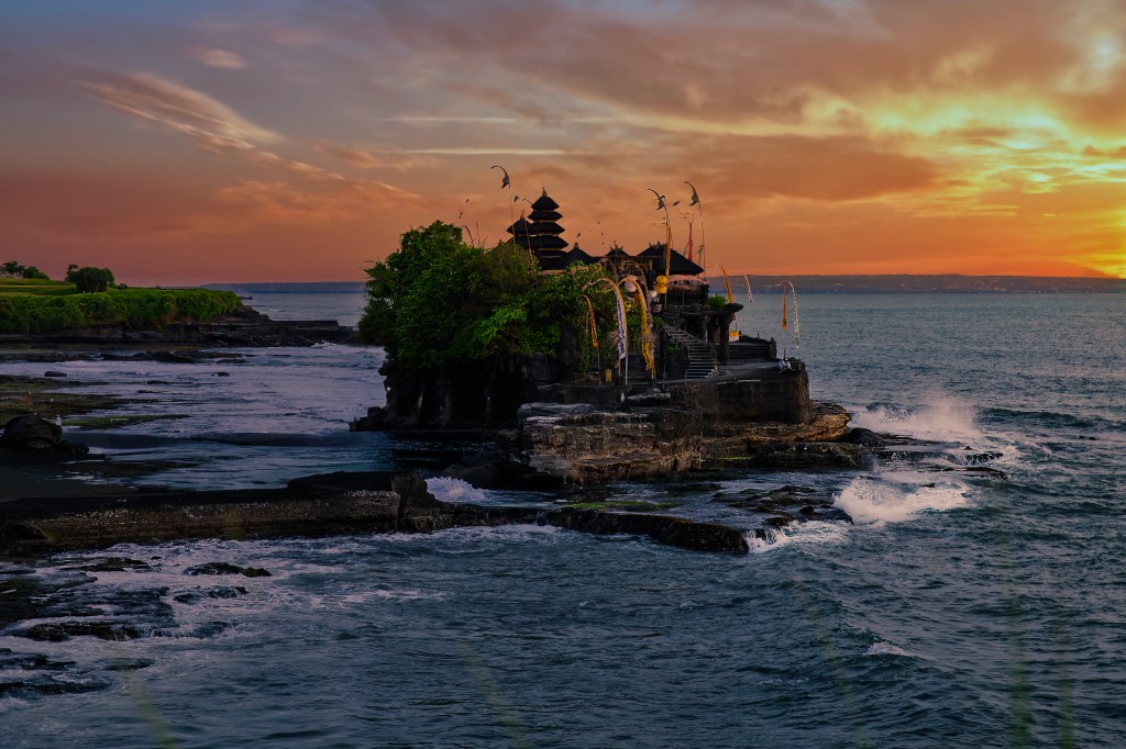 Dari sana, lensa saya membawa saya ke pura Tanah Lot yang ikonik, di mana deru ombak menjadi simfoni upacara sakral Melasti.