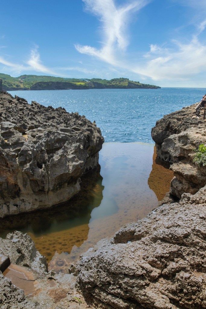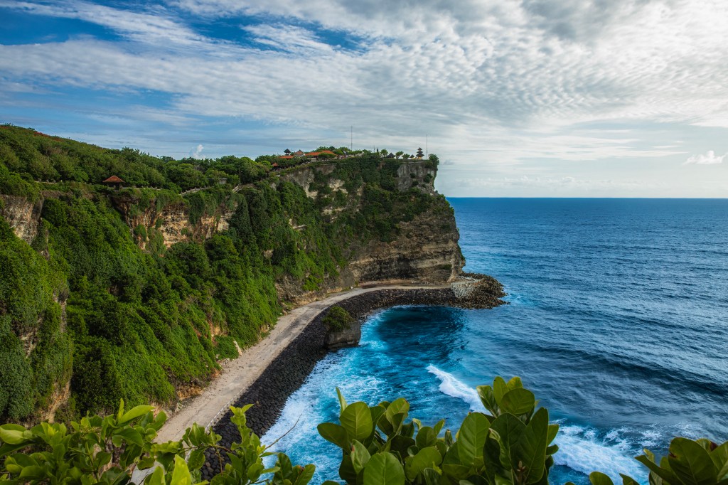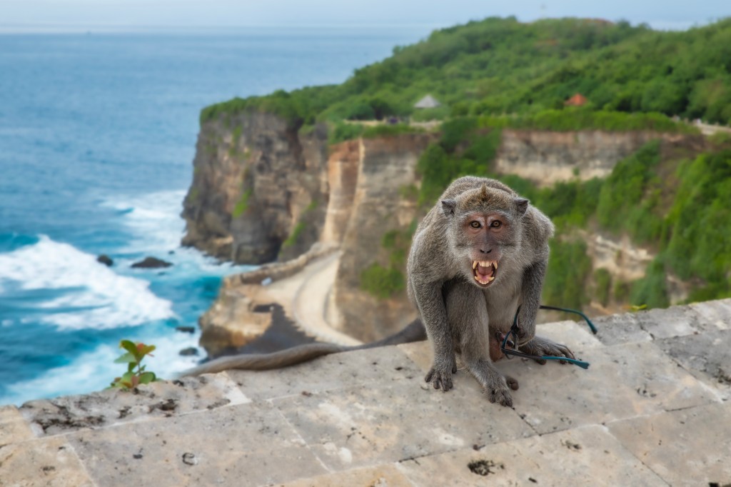 Perjalanan berlanjut ke arah selatan, membawa saya berdiri di tepi cakrawala, di Uluwatu. Di sini, pura kuno bertengger kokoh di atas tebing kapur, ratusan kaki di atas gemuruh Samudra Hindia. Ini adalah tempat dengan pemandangan yang menakjubkan, namun juga penuh dengan interaksi yang jenaka.
