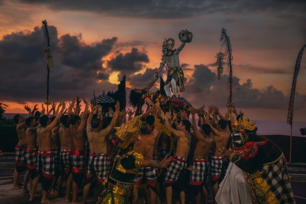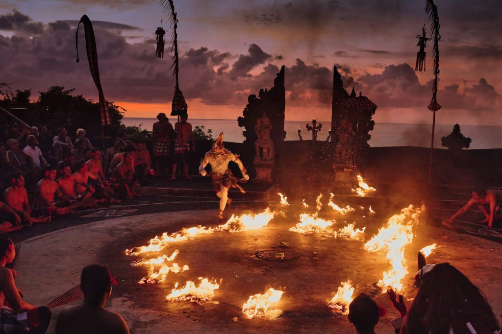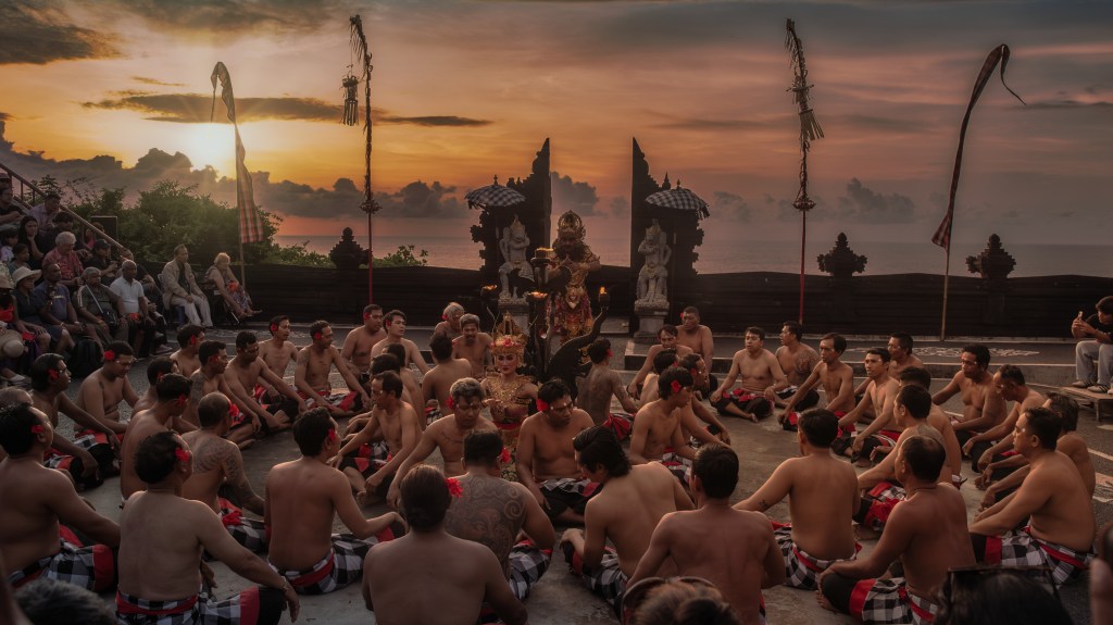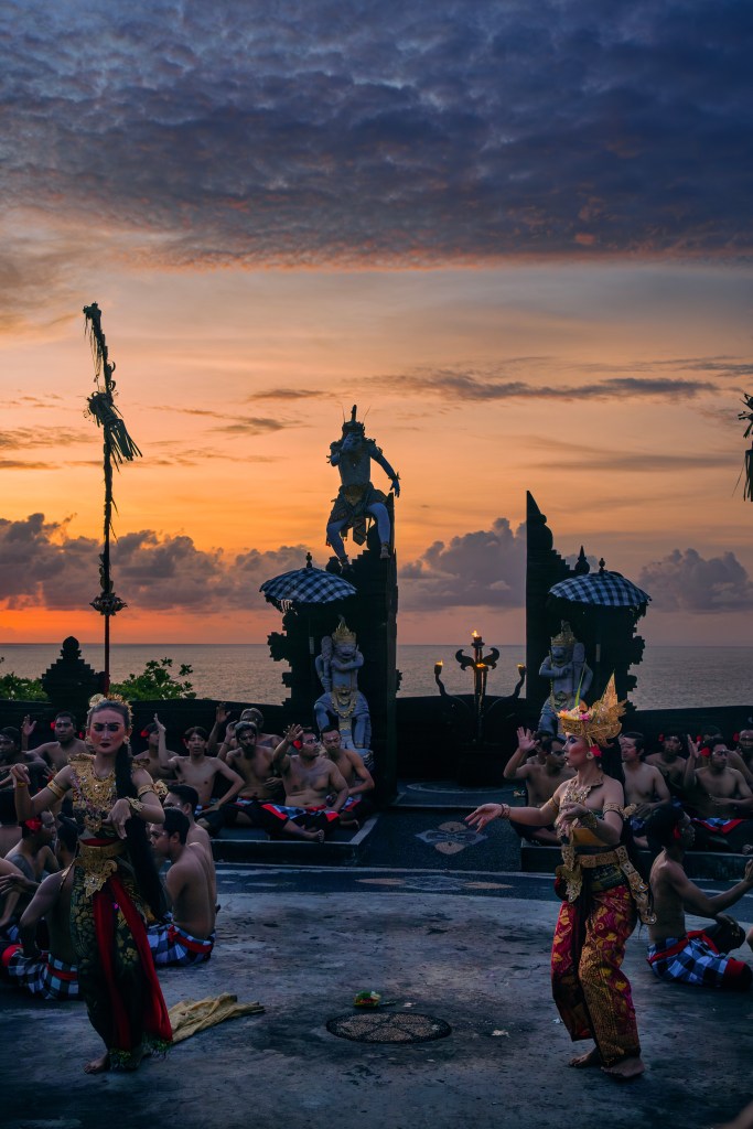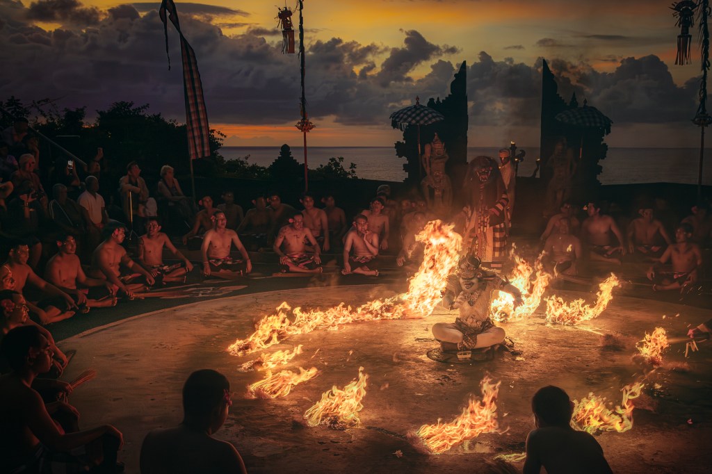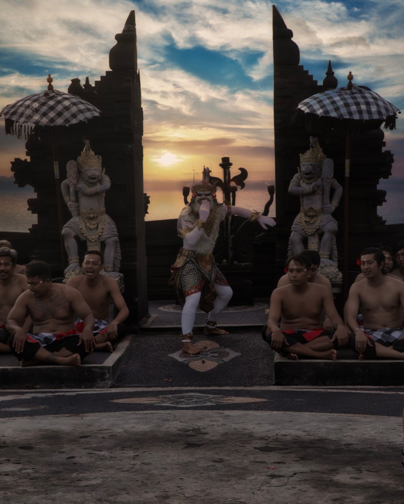 Saat sang surya perlahan mulai tenggelam, mengubah langit menjadi kanvas berwarna jingga dan ungu, suara “cak-cak-cak” mulai bergema. Inilah Tari Kecak Uluwatu. Tanpa instrumen musik, hanya menggunakan harmonisasi suara manusia, puluhan pria membentuk lingkaran di sekitar api yang menyala.